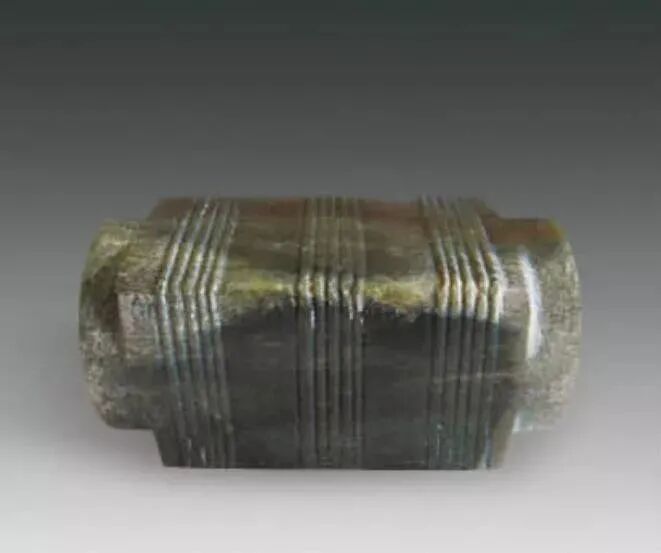 通过观察这件玉琮表面包括角棱的一些痕迹,我们发现玉琮上的这些平行细线纹是在这件玉琮受磨损之后留存下来的,原本的平行细线纹可能更多些,因刻纹相当纤细,大部分被磨去。这种平行细线纹不仅纤细,而且笔直,细线与细线之间距离相等,应是使用平尺一类的工具辅助完成的。其施刻步骤,大概是先在角棱上施刻等距坐标,然后借助平尺一类工具施刻。这件玉琮上十分纤细笔直的平行细线纹,可能还不是制作者最终要表现的纹饰,而可能是制作者施刻纹饰的第一步,即设计纹饰图样,然后依据这种图样进行深加工。深加工的纹样很可能类似于甘肃静宁后柳沟村出土的可能属陶寺文化传统的弦纹玉琮的纹样(图六)[6]。然而制作者中途放弃了深加工的制作,因此这件玉琮应是一件没有最后完成的作品。