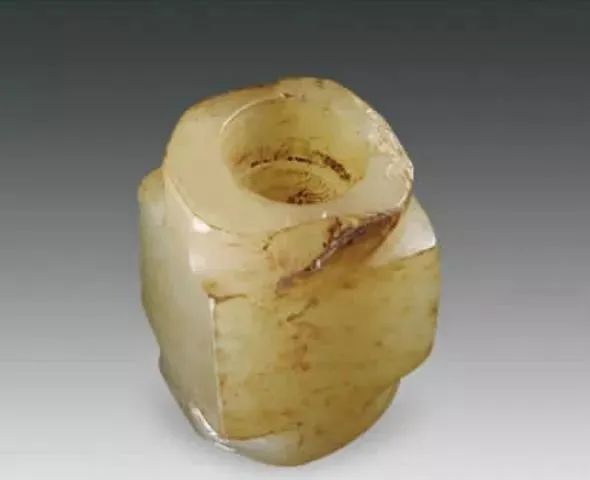 乳白色,有黄、褐斑,内外抛光。形制为外圆角方形内圆的矮筒状玉琮形器。两端有射,射部平面为圆形。四个角面呈弧形凸面,凸面的上下四角为圆弧形,凸面上施刻四五道平行凹凸瓦垄纹。凸面之间形成四壁的竖槽。通高3.2、孔径4.6~4.8、孔壁厚0.3厘米(图三三~三五)。