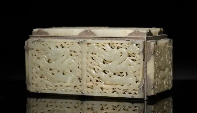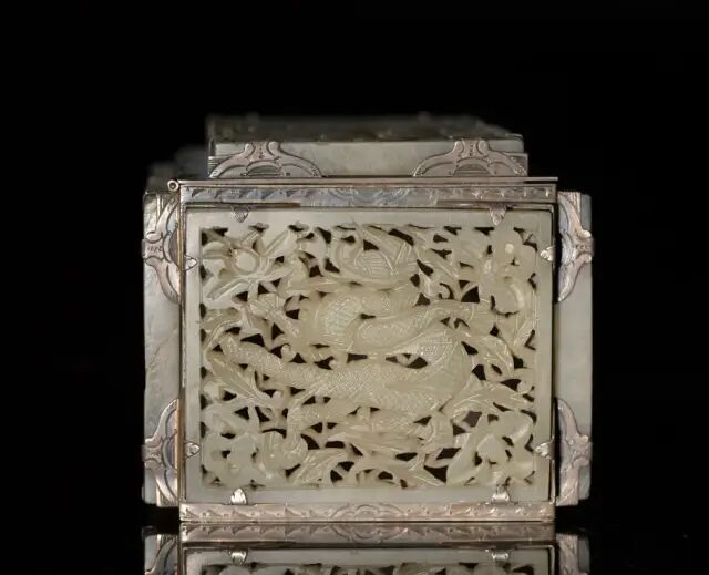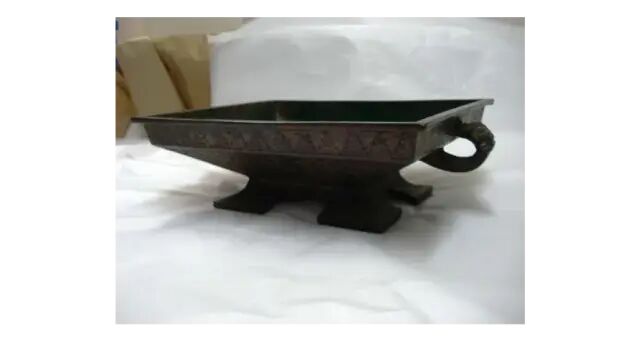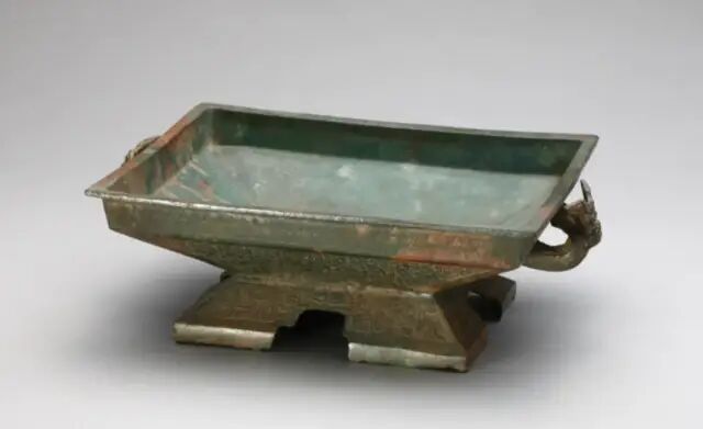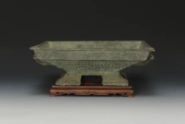 尺寸:8.89 cm X 27.94 cm X 22.22 cm来源:来自华盛顿特区的 Sherer 博士。其母亲作为盟军于1948 年曾驻扎在日本,并在此期间获得该藏品。簠盖呈长方形,口沿折边。斜腹,底平坦,腹略深。两侧附有兽首环耳,方形矮圈足,通体饰细密蟠螭纹。簠即古文献里的「胡」或「瑚」。是古人用来盛稻粱的用具,它的用途相当后世的盘子。早期的簠的特点是足短,口向外移。到春秋末时,簠的足渐变高,器变深,这是断代的特征。由此可判此簠盖应为春秋时期产物。可参阅大英博物馆馆藏,编号1973,0726.25(fig.1)。另参阅故宫博物院馆藏,编号故00076954(fig.2)。