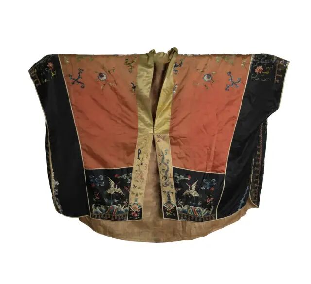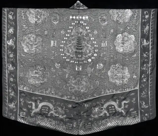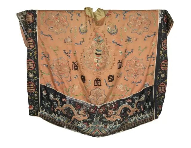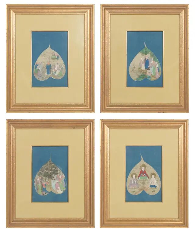 Lot 559 十八世纪 贝叶画罗汉镜框 四个一套来源:来自纽约州北部 Hunter 先生家族传承。菩提树被视为智慧之树,在佛教中被称为圣树。古印度每个寺院都种有菩提,落下的叶子被僧侣视为圣物,在造纸技术还未普及前,印度僧人将其与贝叶树的叶子叠夹在一起,用于写经,后世将这些书写绘制在叶上的佛教经籍和图像统称为「贝叶经、贝叶画」。一件菩提叶画从选材到完工至少需耗时月余:挑出品相完好的菩提叶,经腐蚀、干燥、漂洗制作成叶脉,再依据叶片的自然形状和纹理,起稿、上色,历30多道工序,才告完工。本件作品正面为彩绘贝叶画,内容以佛经典故和罗汉为主,所绘人物眉目神态毕现。背面为蓝底金字手抄《心经》和《金刚经》。乾隆皇帝笃信佛教,他令人制成菩提叶笺,在叶笺上御笔亲书《般若波罗蜜多心经》。他还命内廷画师在菩提叶上精心绘制观音大士、罗汉等墨像,装裱成册,钤以御印,配上函套。本件作品从罗汉与书写经文相结合的形式来看,应是十八世纪乾隆宫廷的佳作。可参阅大都会博物馆,编号12.134.13(fig.1)。另见大英博物馆,编号1894,0216,0.12.1-19(fig.2)。来源:来自佐治亚州亚特兰大女收藏家。她和已故的丈夫曾在亚特兰大拥有一家百货公司并喜爱环游世界。大部分藏品购于1940至1970年代。附有来源证明。缂丝发展到明清,其实用性日益多样化,其欣赏性愈加倾向绘画。乾隆之际缂丝一度极为风行,宫廷装饰皆以缂丝为之,风格则由绚烂趋向娴雅,色彩精丽,技法细腻成熟。此件道袍正面衣襟处饰有一龙一虎。龙虎在道教中有特殊的含义。易经的《乾卦》说「云从龙,风从虎。圣人作而万物睹。本乎天者亲上,本乎地者亲下,则各从其类也。」下摆对称绣有二展翅欲飞的仙鹤。背面装饰极其丰富,近领口处绘以玉兔和日乌,意为日月。背部花纹图案繁而不杂,中间为双龙托宝塔,四周环绕饰以金圆点,并将五岳的符号及「寿」字装饰其间,外围再饰以五个团龙纹及暗八仙纹,整个图案展现出浓厚的道教色彩。两袖以八卦纹、花卉纹、蝠纹交织组合装饰,为典型的吉祥纹样。道士的服装按照地位以及刺绣图案的多寡,主要分为绛衣、道服以及海青三种。其中绛衣位阶最高,刺绣图案最丰富,一般穿着在地位较高的道士身上,应用于重要的仪式场合。绛衣的图案常见有宝塔、灵兽、八卦等,配置并无一定规则,主要是表现出道教的天廷,以及驱邪除魔的隐喻。从刺绣图案及精美程度可以判定,此件道袍应为绛衣。参阅可见芝加哥博物馆馆藏,编号1937.797(fig.1)。另可参阅北京保利拍卖2009年秋拍,编号2094。