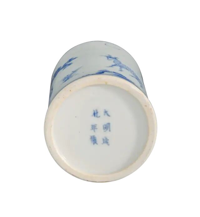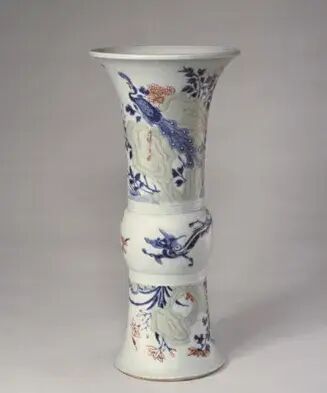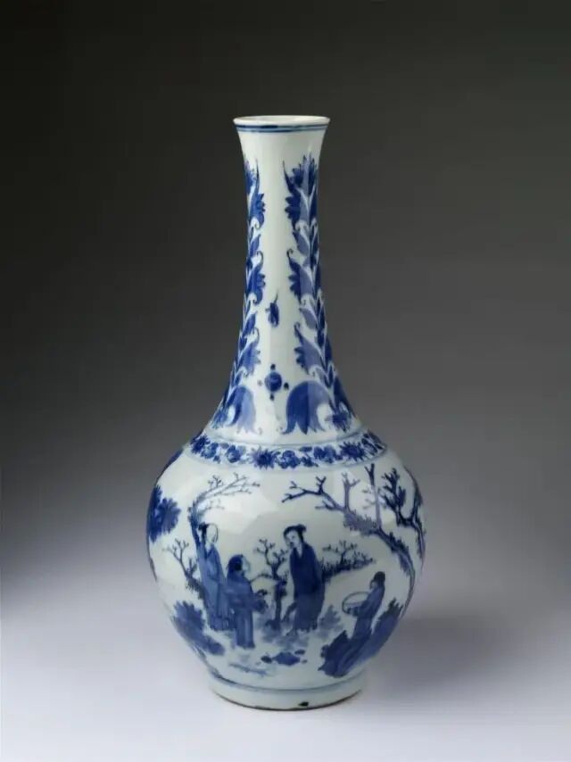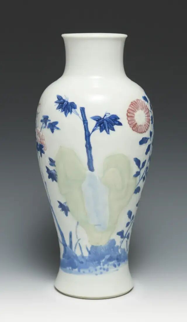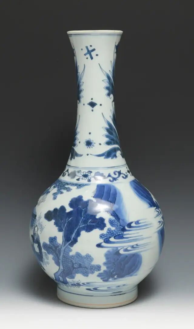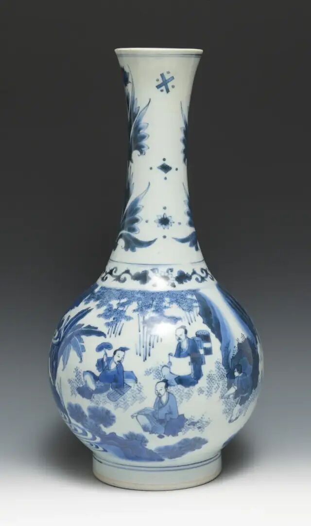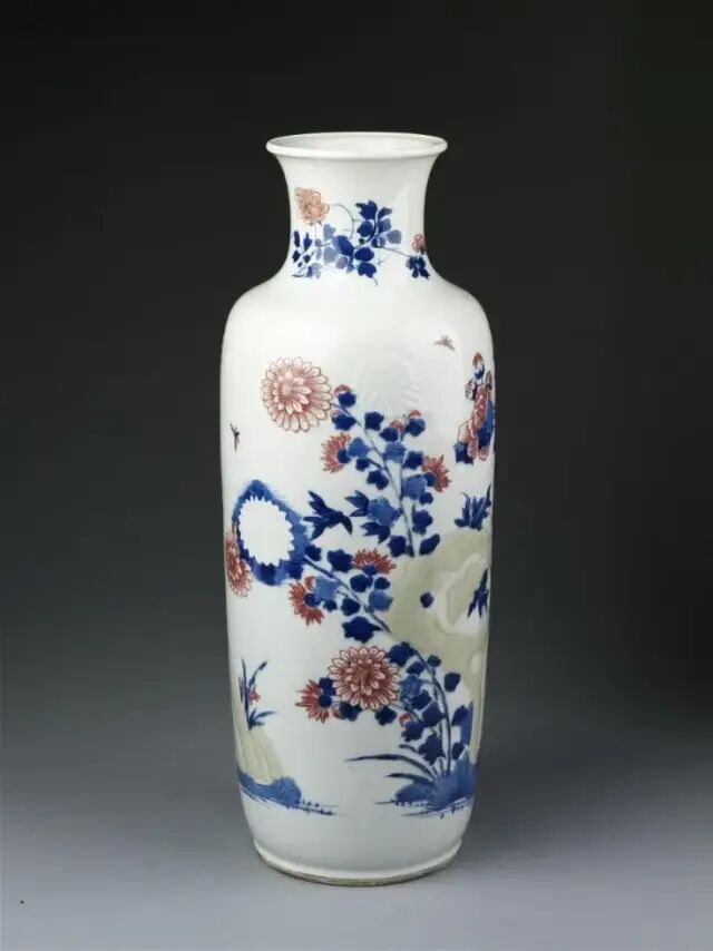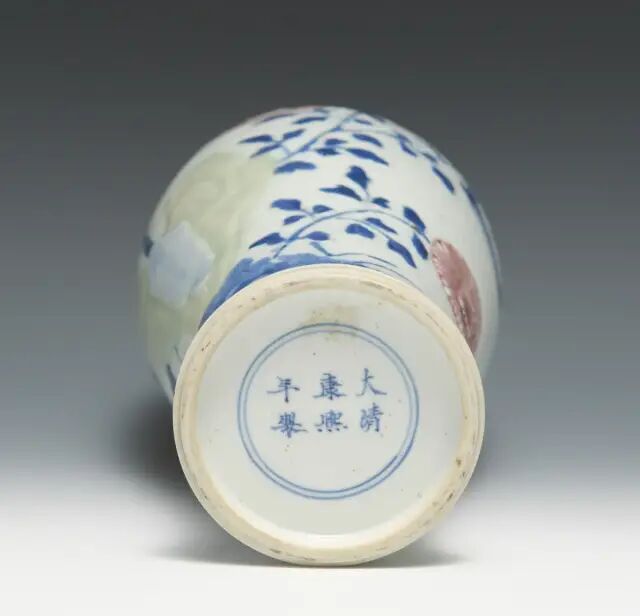 此瓶撇口,长颈,圆鼓腹,高圈足。颈部饰郁金香纹,腹部绘竹林七贤,构图错落有致,层次分明,颈腹之间以一圈缠枝花纹间隔。釉面白中泛青,青花色料采用土青,呈色稳定,青花发色青翠艳丽。竹林七贤是古代著名典故,此图中所绘文人雅士们席地而坐,悠闲地相互切磋文学,或品茶,或吟诗,或抚扇,好不怡然自得。山石树木细致入微,人物形象生动,衣褶折叠错落处尤见功力。晚明时局动荡,官窑停烧,给民窑生产带来蓬勃生机。此时期不存在官、民之间的明显界限,文人阶层也介入手工业生产,制瓷工艺方面也开创了一个新局面。此件作品画工细腻传神,釉质清莹,时代特征明显,应是崇祯时期的佳作。参阅阿尔伯特博物馆馆藏,编号2736-1852(fig.1)。另可参阅苏富比拍卖2012年11月伦敦拍卖,编号042;佳士得拍卖2016年09月纽约拍卖,编号1344。来源:购自纽约苏富比2012年3月20日拍卖,拍品号306。来自佐治亚州亚特兰大资深收藏家。观音瓶是康熙至乾隆时期的流行瓶式之一。此瓶瓶体挺拔隽秀,线条流畅。胎坚质细,通体施透明白釉,釉面润泽。瓶身以釉下青花绘竹枝草木打底,以豆青和青花染山石,釉里红绘饰花卉。纹饰生动流畅,诸色鲜研纯正,画工精美细腻。这就是康熙时期独有的瓷器品种——釉下三彩,集三种色彩于一身。由于三种彩料发色温度的要求不同,工艺复杂,烧造难度大,因此存世量稀少。且本品底部落有「大清康熙年制」青花楷书双圈款 ,尤为难得,堪称康熙时期御窑精品。其历经近三百余年的沧桑,能够传承至今可谓幸事。可参阅阿尔伯特博物馆馆藏,编号C.974-1910(fig.1)。故宫博物院馆藏,编号故00148355(fig.2)。另可参阅佳士得拍卖2011年03月纽约拍卖,编号1659;苏富比拍卖2018年03月纽约拍卖,编号317;北京东正拍卖2011年11月拍卖,编号081。