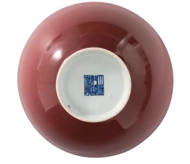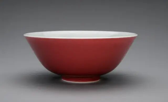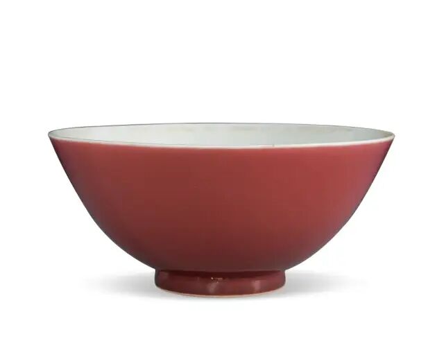 此器色釉均制,形制规整:敞口,弧腹,圈足,底书「大清乾隆年制」六字两行青花楷书款。器内及底部施白釉,其外通体施祭红釉,釉色均匀浓艳,与规整优美的造型相结合,更显天衣无缝。祭红又名「霁红」,明洪武时已烧制成熟,是以铜为着色剂,在高温还原焰中烧成。在乾隆时期祭红釉瓷器是红釉瓷器中的主流品,其器物制作十分规整,且官窑器物大多款识是「大清乾隆年制」三行六字篆书款,堂名款也有出现。可参阅故宫博物院馆藏,编号-新00114291(fig.1)。另可参阅苏富比拍卖2012年03月纽约拍卖,编号238。