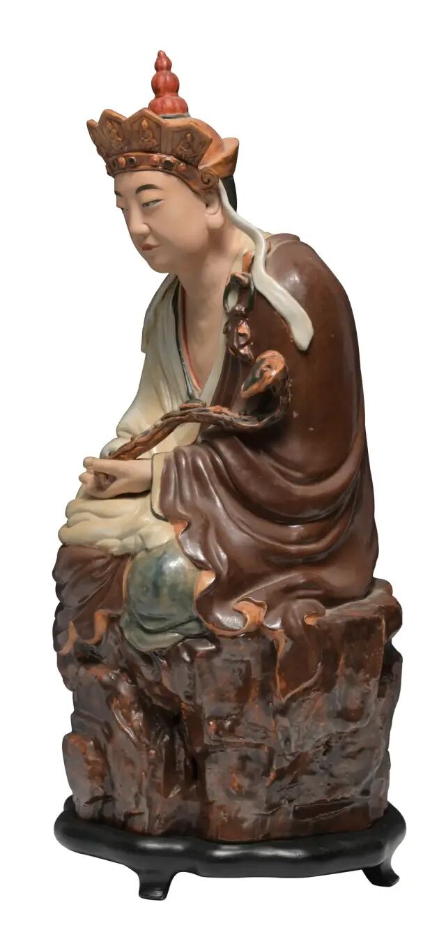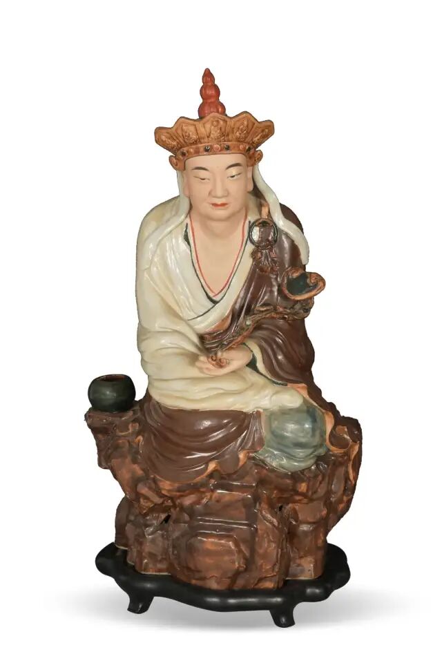 Lot 302 曾龙昇 瓷塑普贤菩萨(附原配木座)尺寸:43.18 cm X 26.67 cm X 20.32 cm曾龙升曾拜游长子为师,因受家庭影响,他从小就爱上了立体雕刻这门艺术。历史典故或者神仙道人题材的瓷塑家不同,曾龙升的表现题材多取自生活来自民间的传说故事。他所创作的雕塑作品其手法精湛,形象逼真,造型传神,塑者多以衣纹繁复,生动细腻,五官清晰,表情丰富的雕塑造像人物为主。所作「孙中山」瓷像,曾获巴拿马国际金质奖,所作《大龙船》更为国宝。此件「普贤菩萨」瓷塑,釉色纯正,头戴帽冠,身披袈裟,浓眉高目,双目微俯,面带肃穆,神态庄严,手持如意,衣饰线条流畅细腻。端坐于石台之上,身边置有一钵,庄严肃穆。造像底部刻有「曾龙升造」四字款。人物造型生动传神,刀法自然洒脱,十分讲究,衣纹处理得肯定而明快,有松有紧,并且强调了转折、顿挫,可以看到作者吸取了传统木雕的手法。在色彩搭配上受民间年画的影响,设色浓郁,艳而不媚,装饰性强,为人们所喜闻乐见。曾龙升所造雕瓷以罗汉摆件居多,本件为菩萨造像,非常罕见,也极具收藏价值,深受藏家追捧。同类型可参阅佳士得拍卖2014年09月拍卖,编号983。另见苏富比拍卖2018年09月纽约拍卖,编号1487。尺寸:10.16 cm X 6.35 cm X 6.35 cm