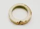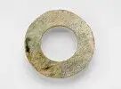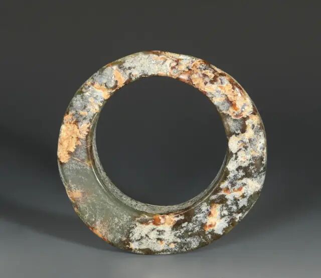 来源:来自马里兰州的 Liaw 先生,其父亲于1980年代 之前在台湾收藏该物品。良渚文化距今约5300-4300年。良渚文化玉器是神崇拜的载体,是贵族阶层权力的象征,也是平民阶层朴素情感与信仰的寄托,在中华玉文化传统中占据着突出的地位。本件作品呈碧绿色宽扁环状,内外璧表面有白色和褐色的沁色,斑斓美丽。器形一头圈壁略窄薄,另一头则较为宽厚 ,应是玉石原始形态如此,就形打磨成环,颇有特色。玉环表面,如同髹了一层透明的生漆,呈现出玻璃光泽,玉环较薄的一边则透光可见。这是制作抛光和几千年土埋受沁的结果,也是任何仿制品不可能模仿出的特征。此类玉环古时多为贵族佩戴之物,搭配作组佩用,彰显贵族礼仪,其丰富的色彩也在同类中较为少见。每件玉器的沁色都是独一无二的,透光性好也证明了其在后世传承有序,历经世事变迁仍保存完好,甚为难得。可参阅美国亚瑟·M·塞克勒美术馆馆藏,编号S2012.9.137(fig.1); 编号F1918.29(fig.2)。另可参阅佳士得拍卖2017年11月香港拍卖,编号2725;佳士得拍卖2015年03月纽约拍卖,编号539。