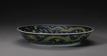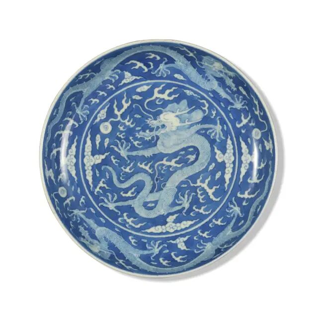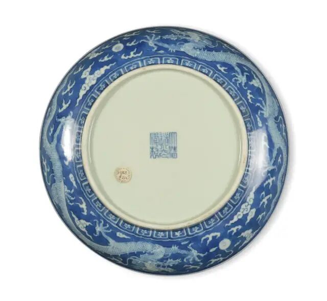 来源:来自英国伦敦古董商 Sydney L. Moss Ltd。此件作品内外皆以青花为地,以留白之法绘云龙戏珠纹。盘心正中所绘苍龙双目圆睁,须发横飞,五爪如轮,肢体矫健,遒劲有力,周身犹如腾云驾雾,威仪不凡。盘壁内外侧各绘有一组双龙戏珠纹。整盘共绘有五条苍龙,生动威猛,呼之欲出。圈足规整,典型的泥鳅背,盘底写有「大清道光年制」青花篆书款,官窑气息浓烈。青花鲜艳,釉质如玉,胎骨洁白细腻。此式器皿为清代官窑经典品类之一,自康熙起流行于各朝之中,宫中必备。道光官窑有不少是仿康熙、乾隆朝风格的作品,此盘就是其中一例。本件器物保存完整,从形制胎体、纹饰等综合来看,可谓是道光官窑器中的精品。故宫博物院有件“道光款蓝地黄彩云龙纹盘”与本件作品相似度极高,可作参考。参阅故宫博物院馆藏,编号 故00161816-1/129(fig.1)。参阅佳士得拍卖2013年03月拍卖,编号1492;苏富比拍卖2015年03月拍卖,编号160。