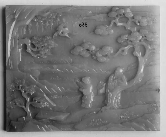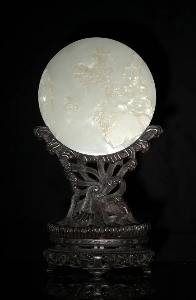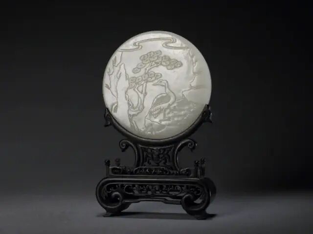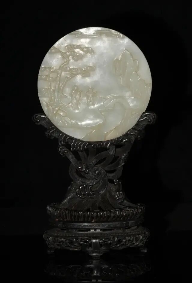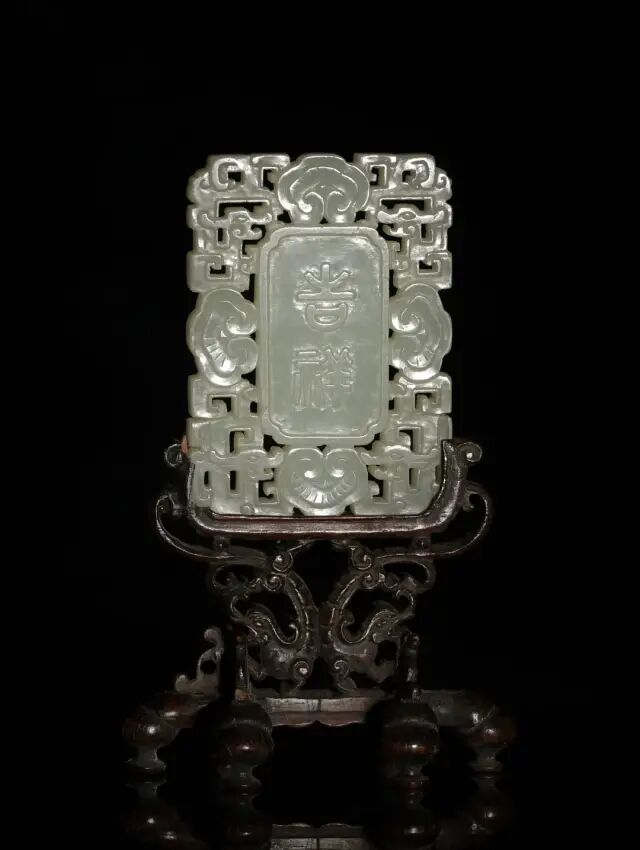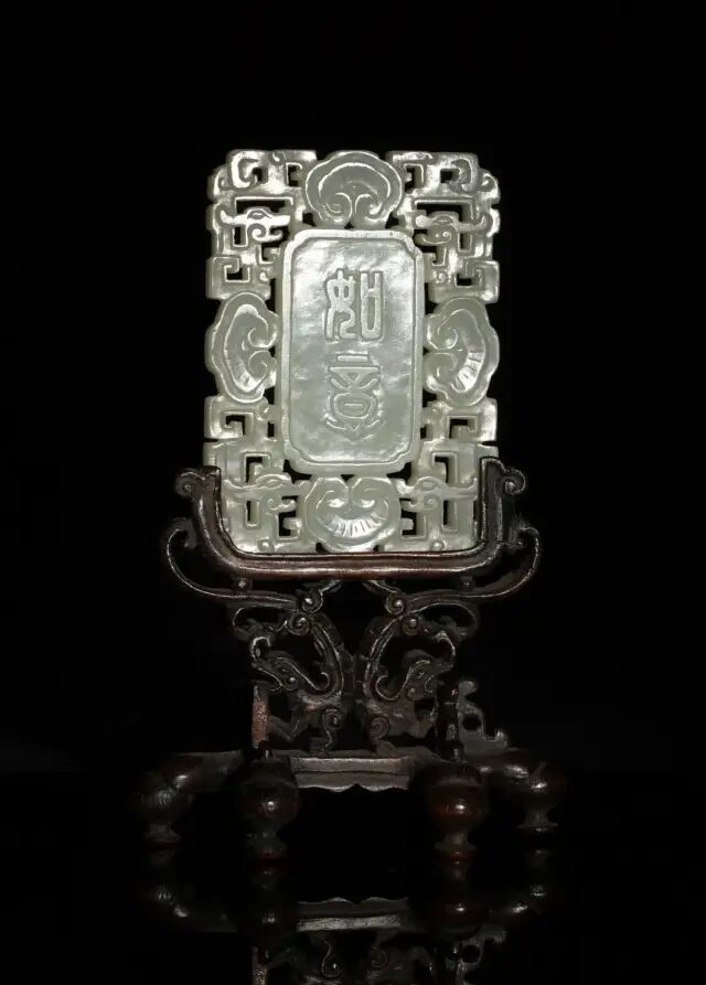 此碗内外均施粉青釉。内壁使用暗刻技法,口沿处饰以回纹,碗心饰以缠枝牡丹纹。外壁则使用浅浮雕技法,口沿处饰以祥云,碗身一圈绘以缠枝花卉纹,寓意吉庆富贵,生生不息。底部刻有「大清乾隆年制」六字篆书刻款,刻款部稍有磨损。此碗造型古朴大气,尺寸偏大,并且使用了多种修饰手法,难能可贵。可参阅大英博物馆馆藏,编号1983,0131.3(fig.1);苏富比拍卖2017年05月伦敦拍卖,编号-227。此件插屏以整块白玉雕琢而成,双面以浅浮雕手法雕刻人物山水花鸟图。插屏正面雕一老翁带着书童准备过桥,远处山峦云环雾绕,溪水潺潺,苍松林立。画面疏密有致,层次分明。背面则是雕刻了花鸟奇石,画面生动活泼,且菊花有吉祥长寿、隐修淡泊之象征,与正面老翁隐居山林的画面相呼应。此屏配以硬木雕海水纹座,海水连绵不断,做工精细复杂,极具十八世纪工艺特色。此类题材在乾隆时期尤为盛行,可参阅各大博物馆馆藏。清宫亦藏有类似插屏陈列,可以参照。可参阅故宫博物院馆藏,编号-故00103187(fig.1)。参阅大都会博物馆馆藏,编号-02.18.638(fig.2)。另可参阅佳士得2011年11月伦敦拍卖,编号33;苏富比2007年10月香港拍卖,编号1579。Lot 204 十八世纪 白玉镂雕吉祥如意牌(附原配硬木座)尺寸:6.35 cm X 4.44 cm X 0.63 cm
