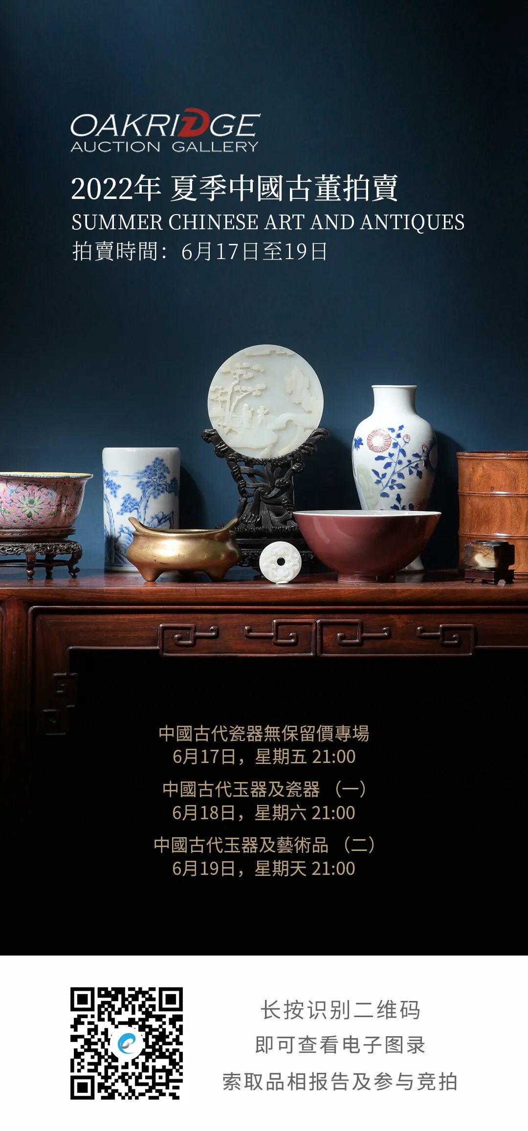 6月17日至19日,奥克里奇将举行『夏季中国古董拍卖会』,欣呈三大专场,522件拍品,包括瓷器、玉器及各种杂件珍品。联拍在线将全程直播,并提供实时同步竞拍技术和服务支持。