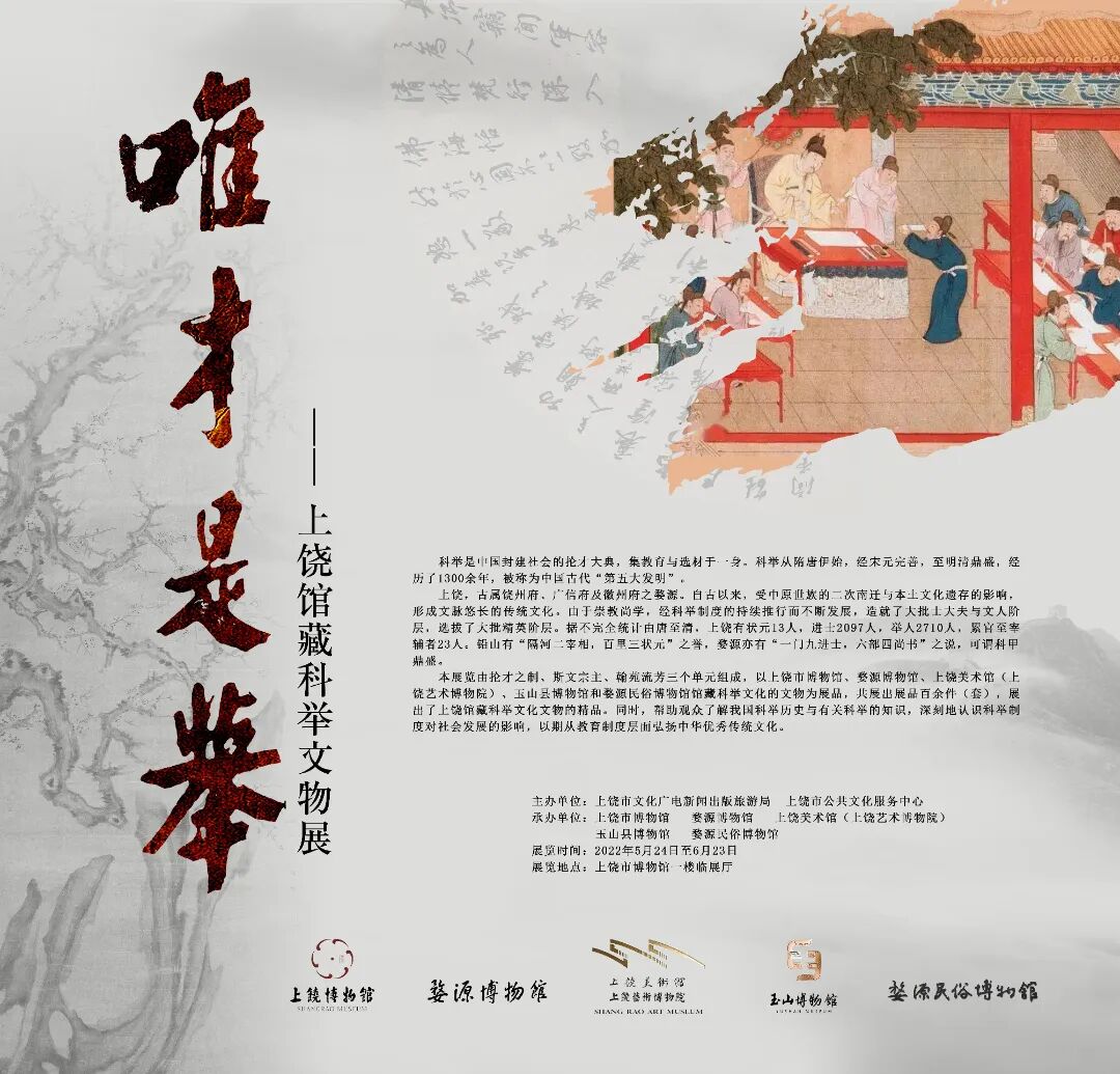 展览通过核心展品“伏鸟双尾青铜虎”及新干大洋洲商代大墓出土文物,揭秘“小鸟虎”的前世今生,感受新干大洋洲商代大墓的神秘与江南青铜王国的辉煌。融合艺术创作、现场操作、多媒体展示等多种交互形式,打造集历史、艺术、公益、文创于一体的多元展览,在丰富多彩的体验中,点燃好奇与求知的火花。展出时间:2022年6月1日—2022年8月31日展览荟萃明清两代11个经典画派,88位画坛名家78件(套)绘画精品,大家云集、群英荟萃,时间跨越明清两代,展现五百年来的笔墨风华。展览时间:2022年5月18日—2022年8月18日妙想天开:米芾的书房——襄阳市博物馆馆藏书法拓片展本次展览为赣州市博物馆与襄阳市博物馆联合举办,集中展示53幅襄阳米公祠碑刻拓片,展现米芾眼中属于宋人的诗情画意与生活情趣。本展览由抡才之制、斯文宗主、翰苑流芳三个部分组成,以上饶市博物馆、婺源博物馆、上饶美术馆(上饶艺术博物院)馆、婺源民俗博物馆藏科举文化的文物为展品,共展出展品百余件(套),展出了上饶馆藏科举文化文物的精品。展览日期:2022年5月24日—2022年6月23日本次展览作品精选出我国及俄罗斯、朝鲜等国当代书画艺术精品近百幅,有油画、国画、水彩画、书法等,既有优美的自然风光,又有浓郁的人文风情,展示“一带一路”沿线国家的艺术交流与文化交融。展览时间:2022年5月18日—2022年7月18日展览由“筚路蓝缕 以启山林”“实业救国 敢为人先”“经营乡里 泽惠后世”“精神不朽 丰碑永铸”四个单元组成。通过大量珍贵的历史文物和图片展示张謇以大生集团为核心,兴办的一系列实业、教育、医疗、慈善、公益事业及营建“中国近代第一城南通”的成就。展出时间:2022年5月18日—2022年7月18日![]()