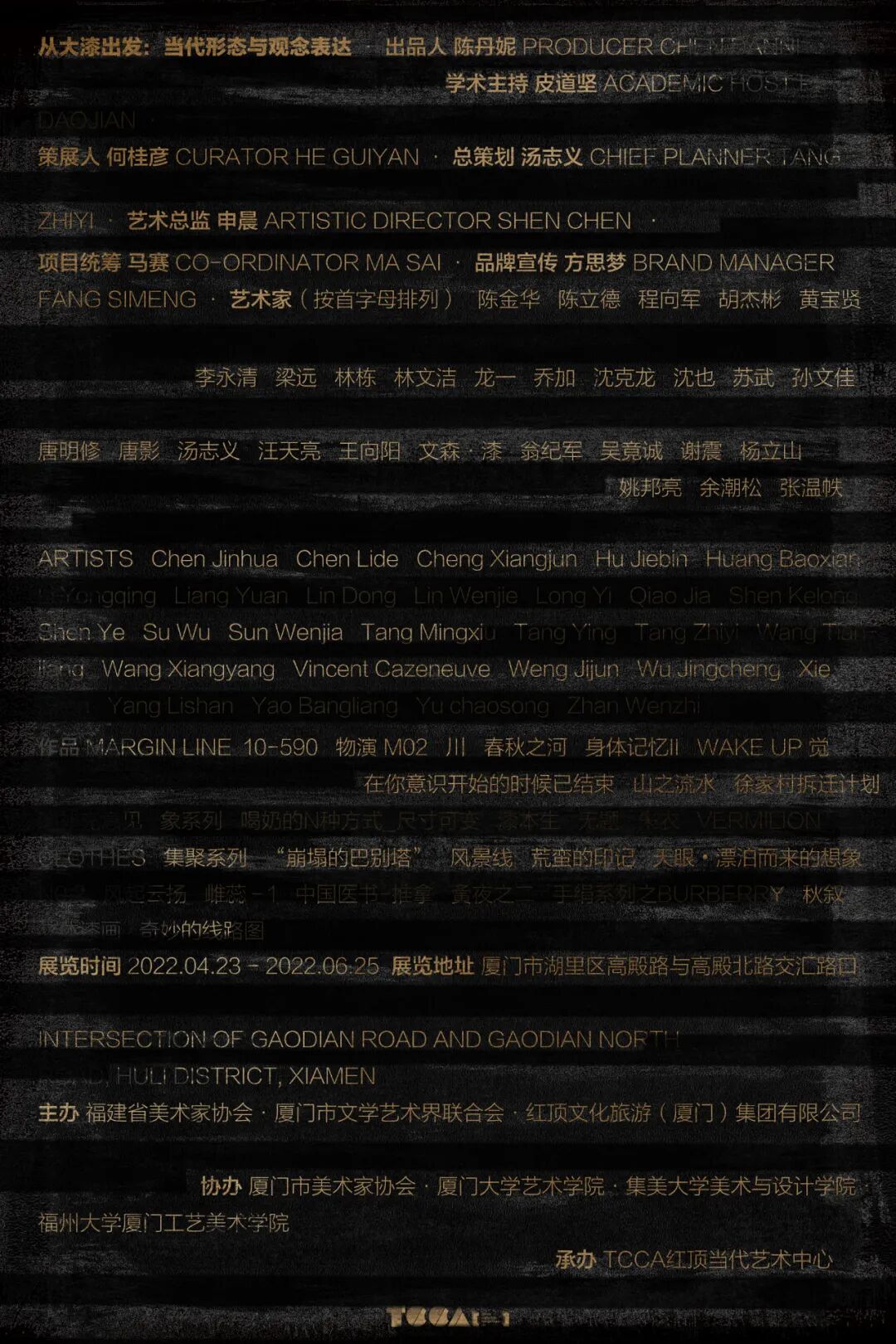 本展览通过120张图片和52件(套)文物,力求回溯并呈现郑成功赤胆忠心的爱国情怀和浩气长存的英雄气概,激励后人见贤思齐,慷慨前行,为实现中华民族伟大复兴的中国梦而努力奋斗。展览时间:2022年5月18日—2022年8年18日展览汇集了28位艺术家的80余件作品,包括绘画、装置、雕塑、影像等。希望借由大漆这一东方文化特有的材料,于展览中构建一次上溯千年,所指未来的时空对话。展览时间:2022年4月23日—2022年6月25日展览地址:厦门湖里区高殿路·TCCA红顶当代艺术中心红色回响——中国工农红军东路军东征漳州红色标语展