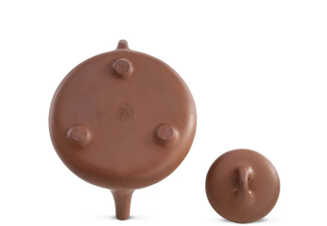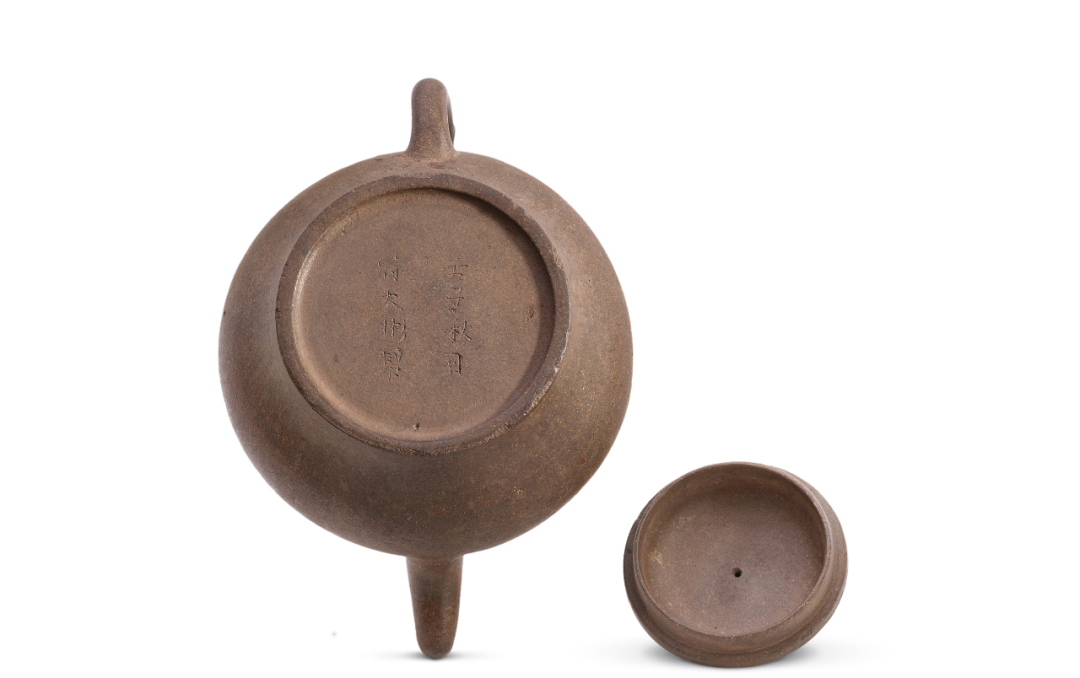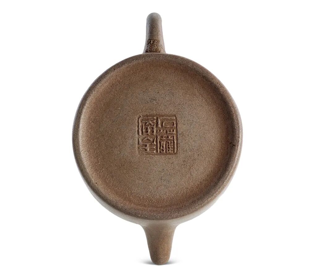壶作匏瓜式,短颈、溜肩、圆墩腹。壶身沿势向下内包底,平底呈微捺。压盖厚唇,盖面穹起,中饰桥钮,气孔周正,弯流上引胥出,壶鋬昂扬。观全器线条比例饱满,隽雅质朴,典型文人壶气韵。署款“不远复斋主人”或为吴大澄斋号,据悉“不远复”此句更早出自宋代理学家刘子翚,然临终前将此三字作为平生绝学传授给朱熹,由此传开。