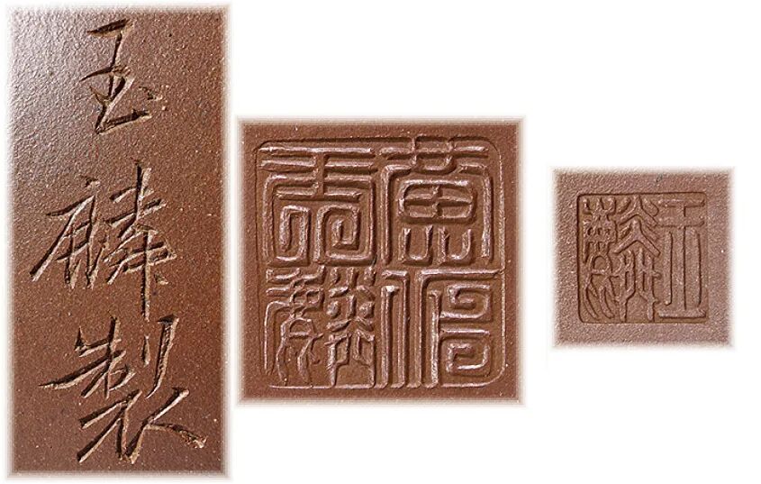 黄玉麟(1842-1914):清末制壶名家,为邵大亨之后又一重要的制壶大家,曾为愙斋吴大澄延聘制壶,赏鉴家珍之。顾景舟评谓:造诣在杨彭年、宝年、昆仲之上。他所制的壶选泥讲究,传世有掇球,供春、鱼化龙等壶式,作品莹洁圆润,精巧而不失古意,灵妙天然。有说他“每制一壶,必精心构选,积日月而成,非其重价弗予,虽屡空而不改其度”。