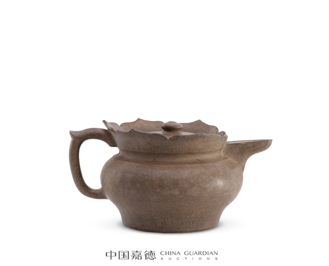 形态圆柱,口盖平嵌,饰以五朵莲瓣,间距排列,造型外撇。盖面隆起一阶,中竖滴珠钮,气孔周正。中压鼓腹,形似扁灯,短颈饰凹槽,叠于提肩上。鹧鸪流,夔龙鋬,平底承圈足。观全器线条流畅,体态质朴,极具神韵。