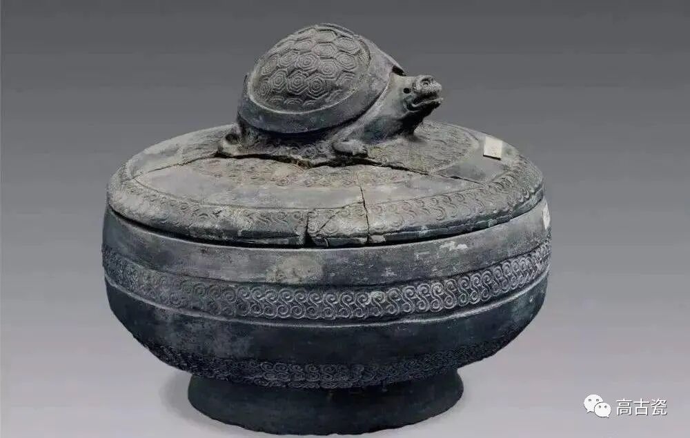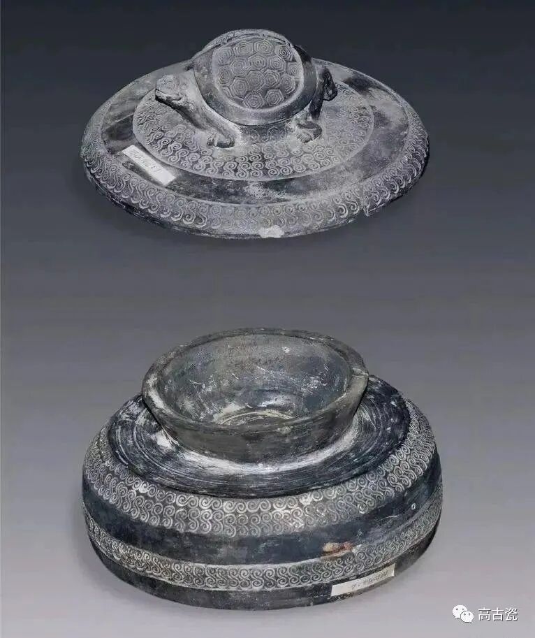 12号墓出土。盖直径15.5厘米,高5厘米,器身高7.8厘米,圈足直径9.5厘米。盖纽为龟形,器身呈扁圆形,子母口,圆直腹,圈足。龟背饰五角回纹,盖纽四周、盖边缘、腹部及下腹部均饰云雷纹(S纹)。盖残。