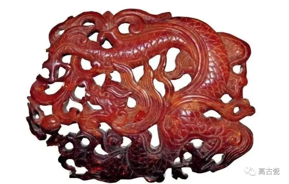 3号墓出土。宽5厘米,厚0.73厘米,长6.5厘米。为半透明红琥珀,透雕云龙纹,佩饰。完整。
