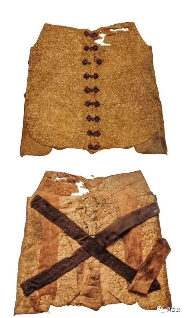 4号墓出土。长26厘米,高30厘米。形似背心,为两层。表层为褐色地加金线织成的菱格宝相花纹织锦,衬里为褐色麻制品,背心后面有带两条下垂,中间为两条相交叉的布带,均为棕色。前为开襟,有9个盘花扣。局部少残。
