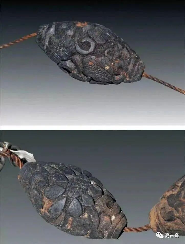 4号墓出土。珠径1.2厘米。以16枚乌木雕核花面橄榄核与14枚白色料珠相串连成饰物。