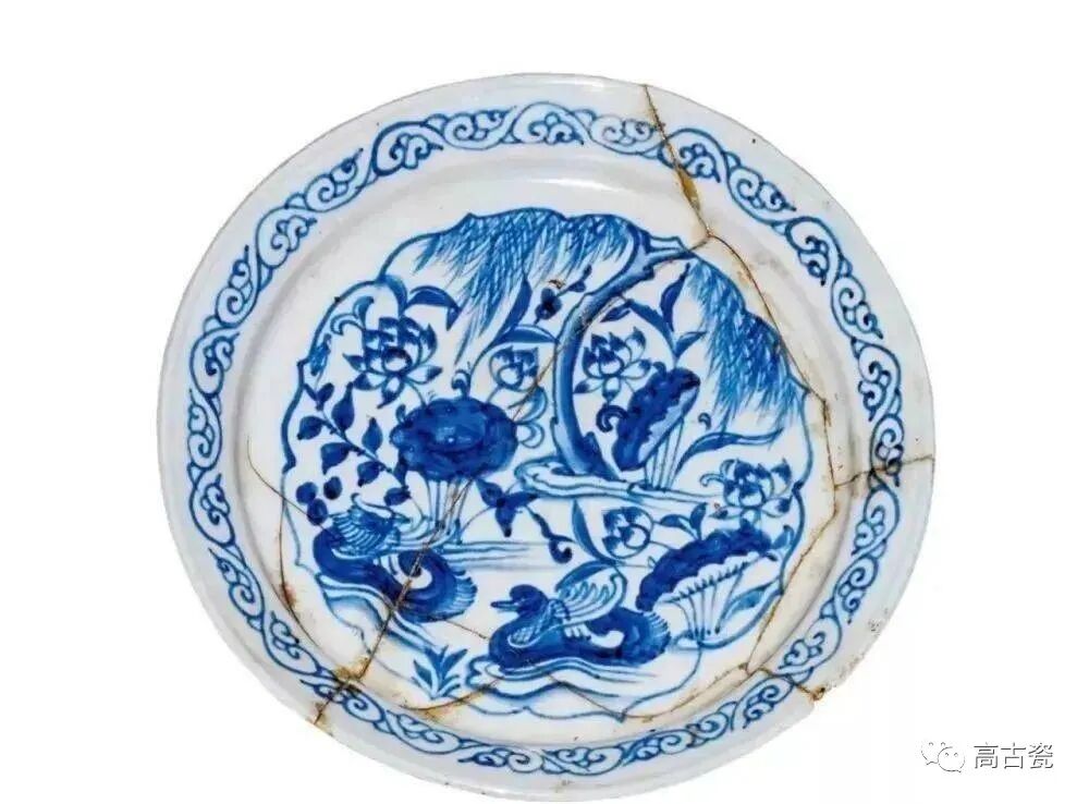 21号墓出土。高2.5厘米,口径16厘米。折沿,浅腹,平底,施白釉,底部未施釉。口沿及内底饰青花纹饰。口沿饰卷云纹,内底饰垂柳、荷花及游鸭等图案。破裂后粘接。
