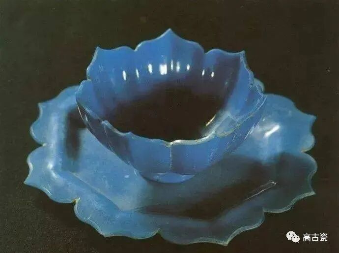 迄今为止, 它是我国出土的最完整的一套元代玻璃托盏,由盏和托两部分组成,为普兰色半透明玻璃质地,盏身呈七瓣莲花形,托腹壁直外撇呈八边形,外边沿呈八瓣莲花形,胎内气泡比盏内多。托与盏搭配得相得益彰,宛如蓝色夜幕下一朵盛开的睡莲。