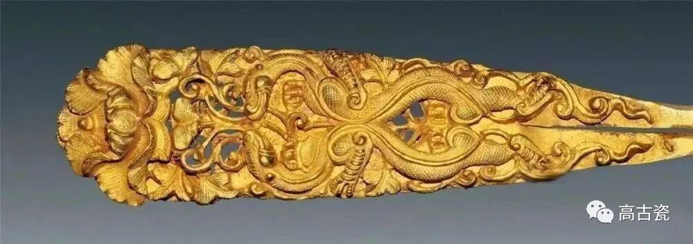 19号墓出土。宽1.5厘米,长14.5厘米。双股,端部宽,顶端饰荷花纹,下接双龙抱珠图,焊接工艺。完整。