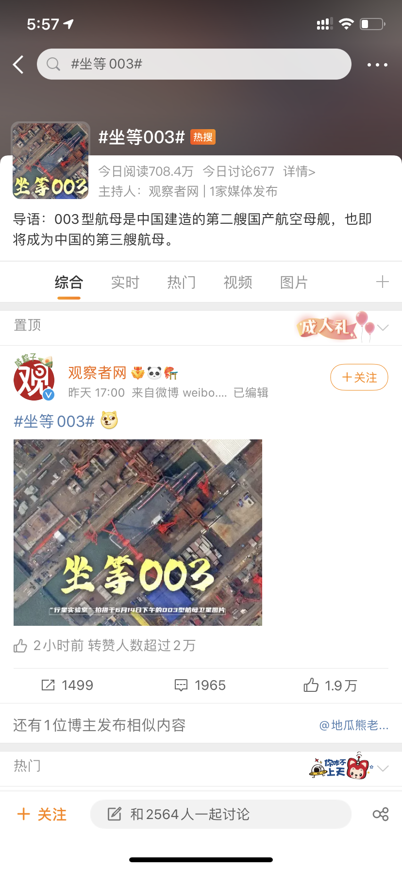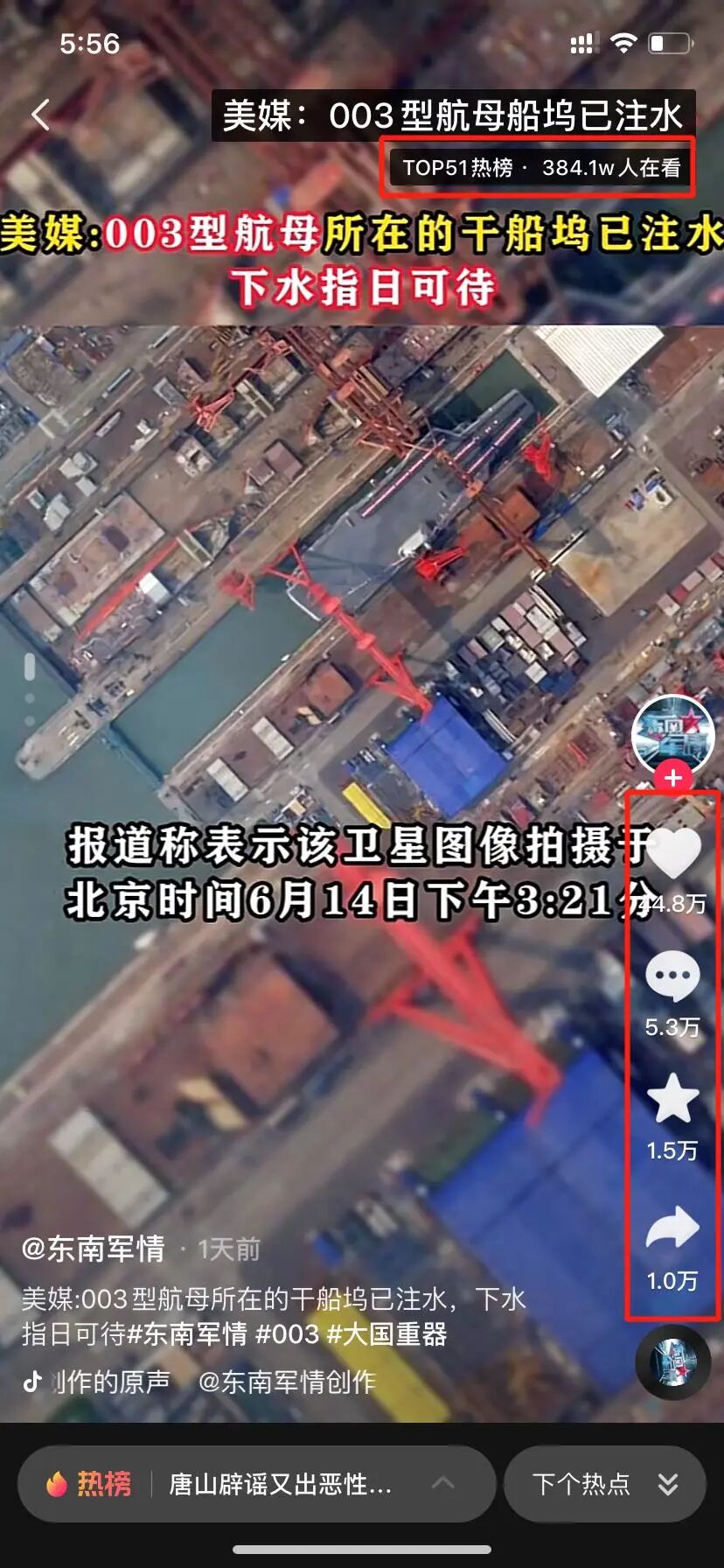 虽然端午节当天,003并没有如大家所愿,如期下水。但是关于003型航母到底哪天下水的猜测,并没有停止,反而不断发酵。