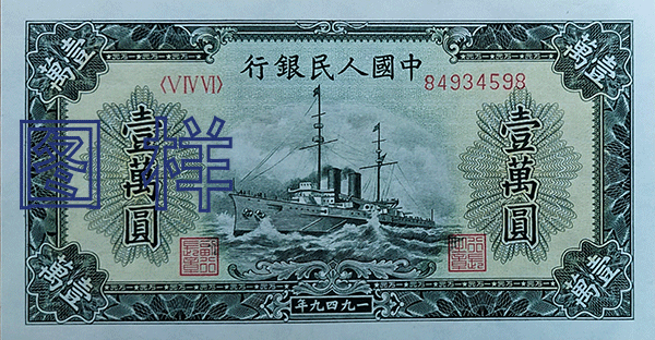 在第一套人民币中,有一枚面值10000元的纸币,票面主图是一艘乘风破浪的军舰。