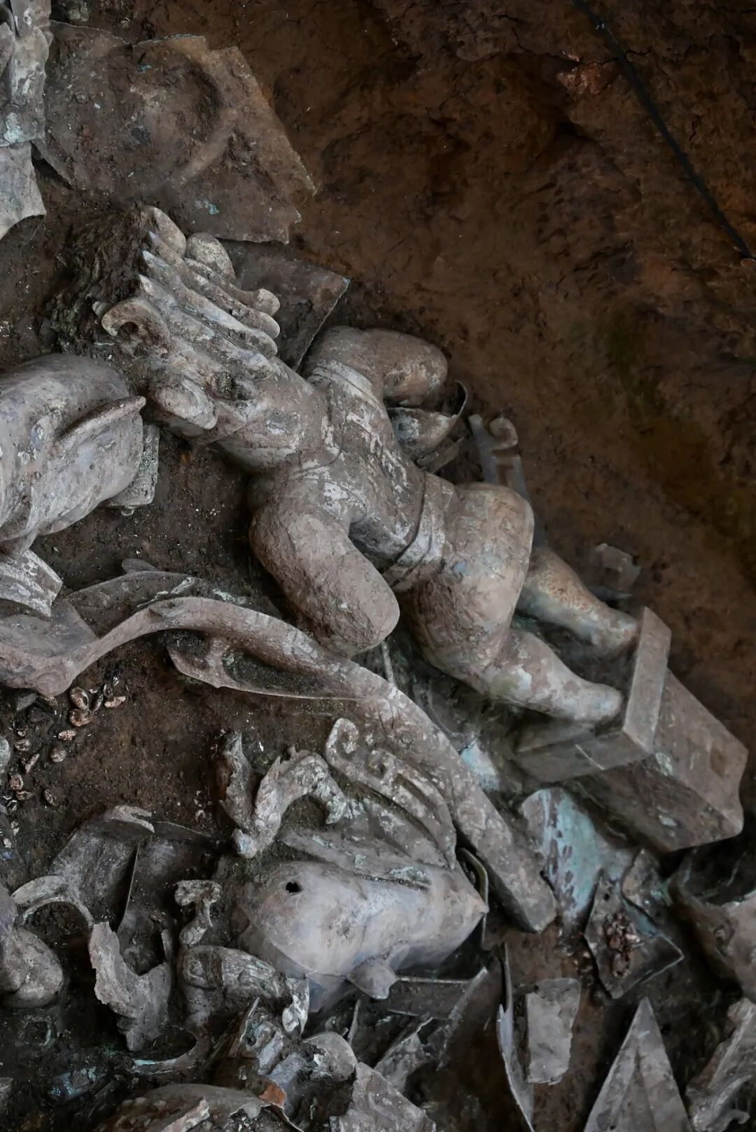 8号“祭祀坑”新发现的顶尊蛇身铜人像分为三部分,中间是一个人首蛇身、凸目獠牙、戴有牛角面具的铜人像,它的双手撑在一个带方座的青铜罍上,头上还顶着一个朱砂彩绘觚形尊,但在坑里没找到它的下半身。