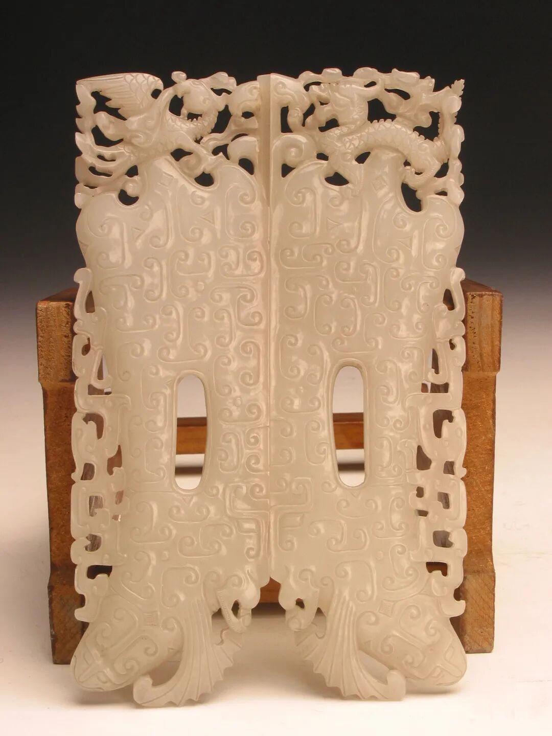 全器由整块白玉所制,为较特殊的造型,左右主体结构相同,形成同心玉璧。器身左右各有穿孔,表面浮雕卧蚕纹;玉璧周围装饰镂空图案,上部左侧镂雕凤纹,右侧镂雕龙纹,左右镂雕夔龙纹,下部镂雕装饰图案。此件藏品反映了清代皇室对婚姻天作之合、龙凤呈祥的喜庆观念。