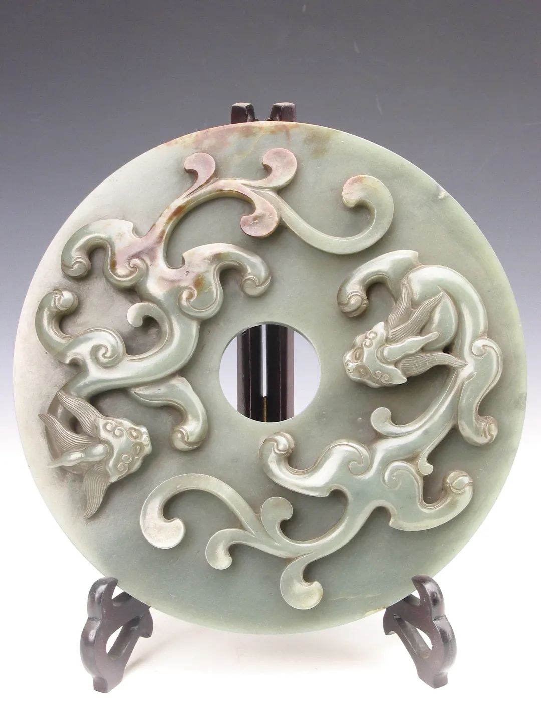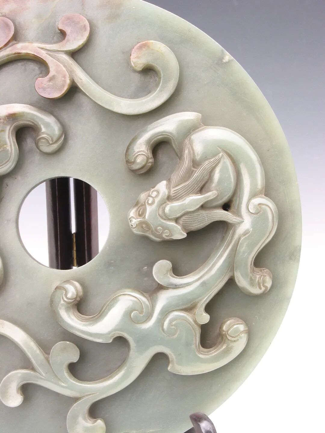 玉质润泽,一面地子光洁平滑如镜,上浮雕双螭纹饰。双螭呈首尾追逐状,独角上挺,鬓发飞扬,眼、鼻、口集于面部下方,四肢自然弯曲,并加饰勾云纹,螭身曲折多变,尾部呈勾云状分叉。