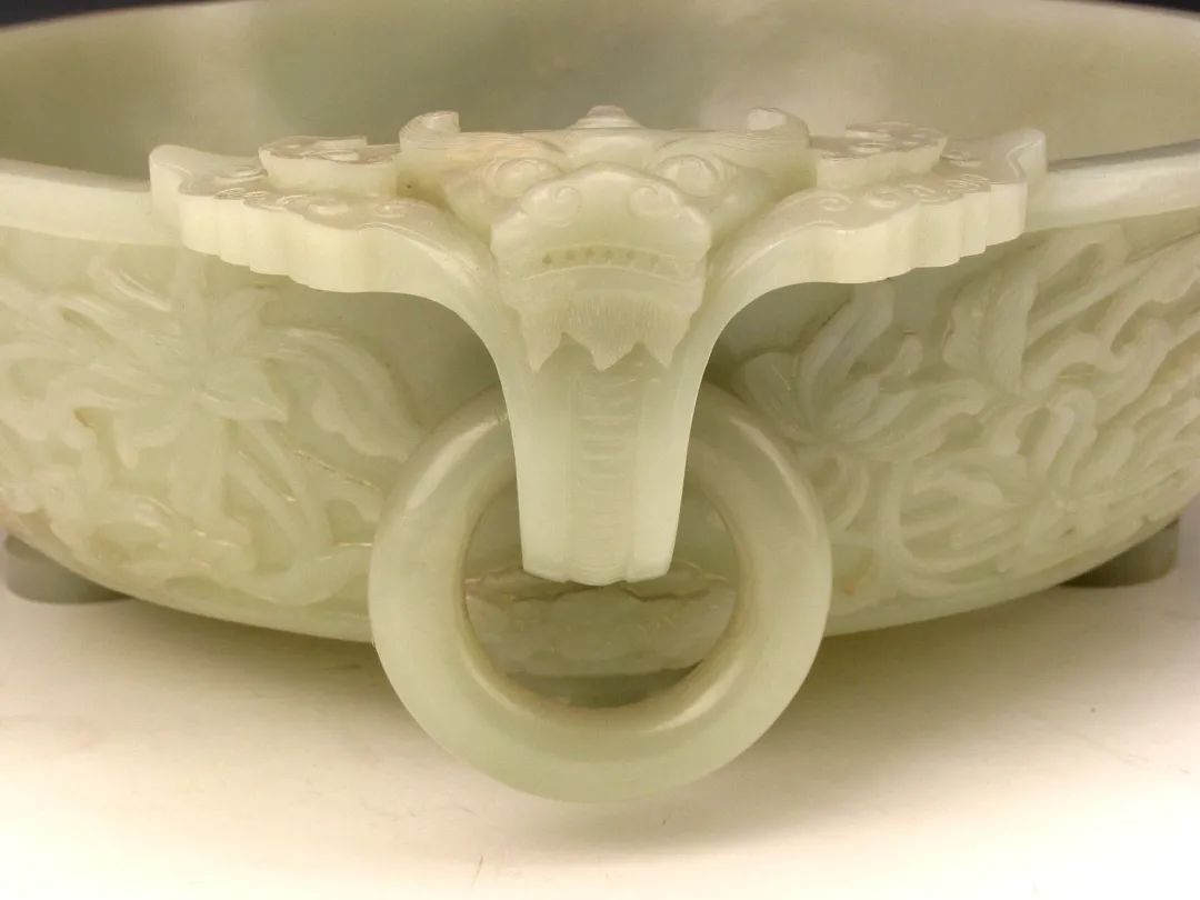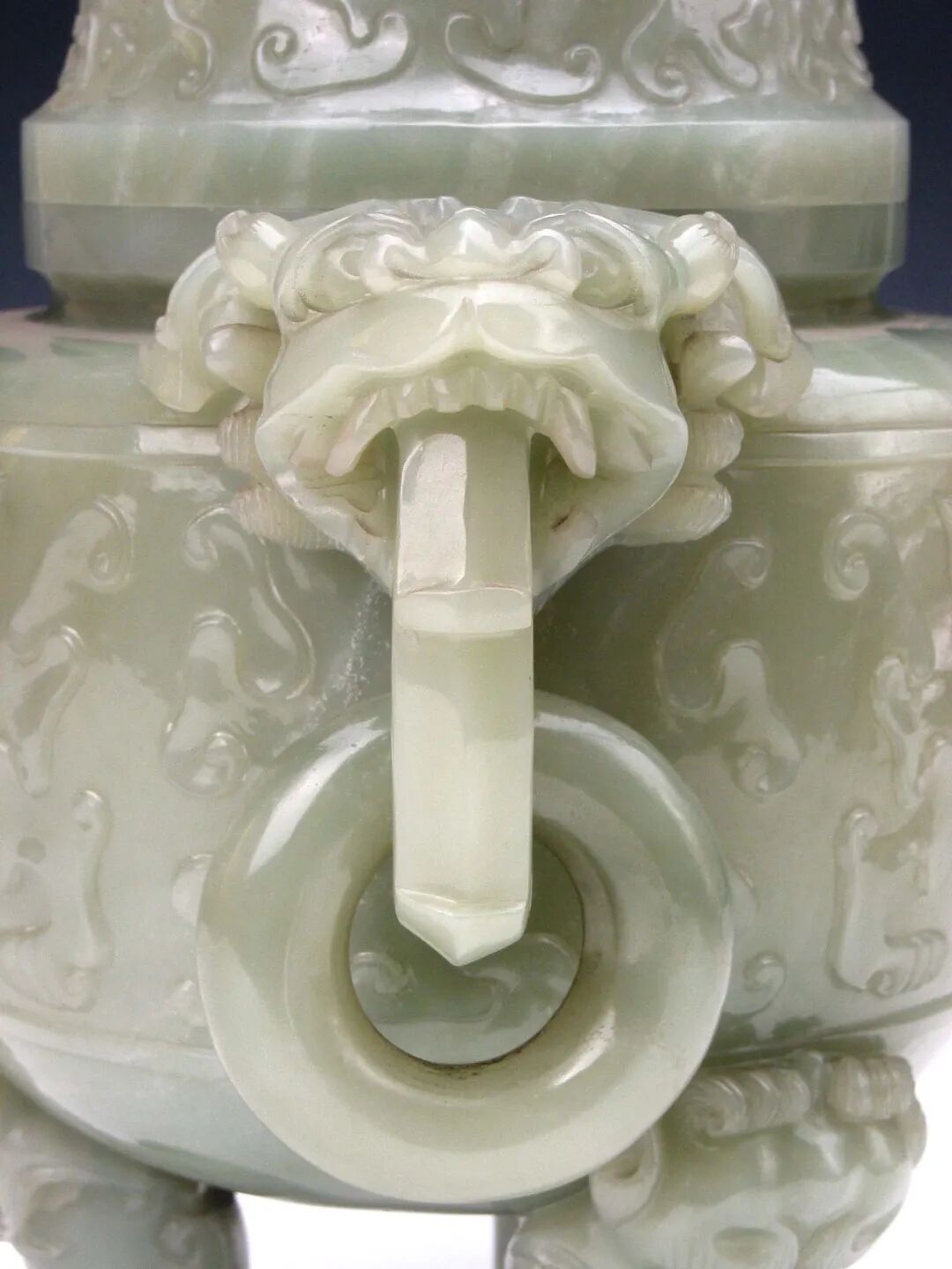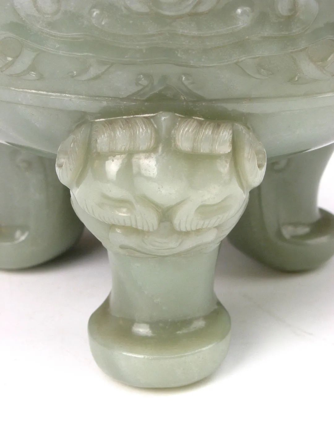 香炉下部为鼎式三足,雕以兽面纹饰。整件器物以兽面纹饰为主调,繁简有序、古朴大方、造型典雅,体现清代玉器制作工艺的高超水平。