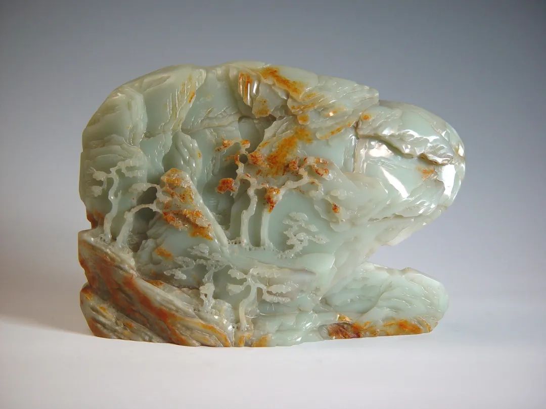 此山子为室内陈设用品,以白玉制成,为立体山形,一面高浮雕山水、松树,山石陡峭,在山石边缘处生长数棵松树;另一面透雕、高浮雕凉亭、瑞鹿兽及高山绝壁、石阶、飞瀑。玉料以白色为主,间杂秋梨玉皮色,俏色选景于松树叶及山石当中,增添了浑然天成之趣,使整个器物层次丰富,具有远近差异的绘画效果。