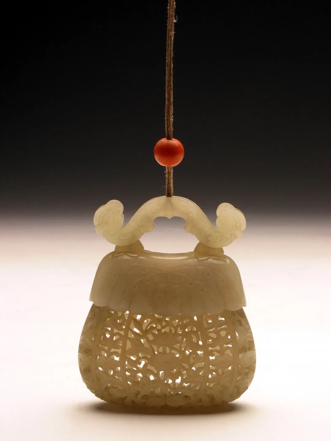 香囊为花篮形,造型别致,线条流畅,玉质青白光润,透雕莲池纹样,周边铺满卷草纹为地,枝蔓交结,纹饰满工,布局合理。整器精工细作,虚实结合,层次丰富,穿绳上饰以一颗珊瑚,色泽暗红,古朴雅致。