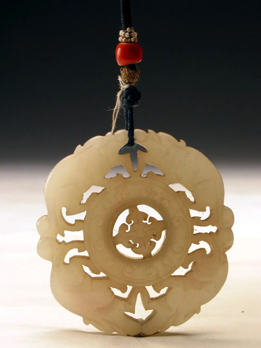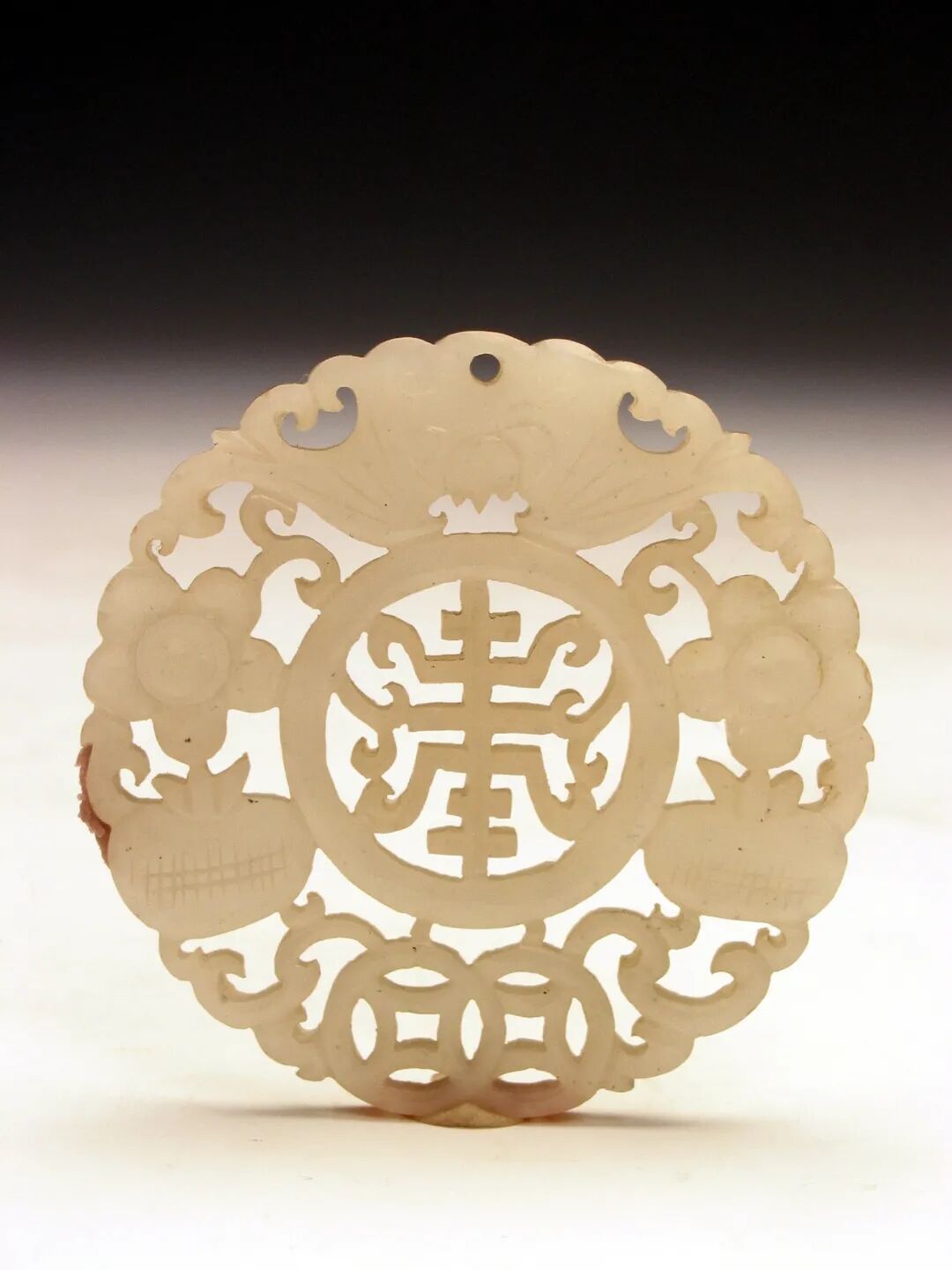 佩身呈正圆形,体型小巧玲珑,造型别致新颖。中心琢团寿图案一枚,字形规整、端庄。外缘上部镂雕蝙蝠一只,“蝠”谐音“福”,形象写实,造型生动;左右两侧对称饰有花朵与石榴纹样;下部为两枚相叠的铜钱纹,组合的图案是民间广为流传的吉祥图案。