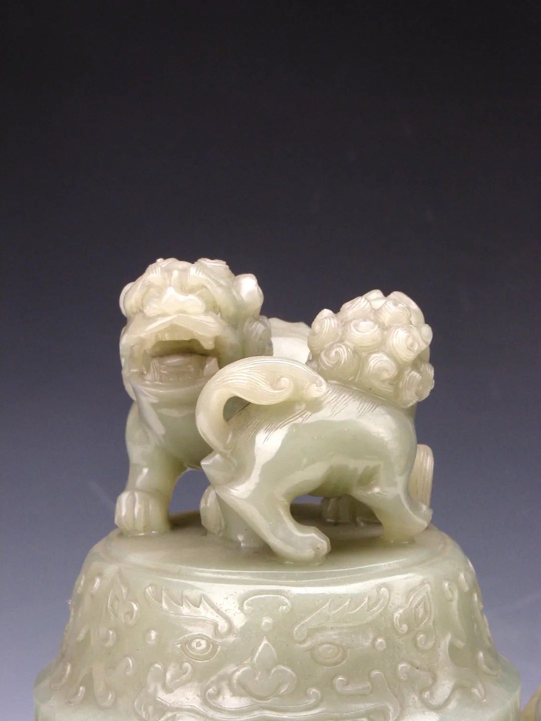 这件玉器仿照青铜器型,全器由盖和炉组成,盖顶圆雕双狮纽,两狮相向而立,精镂细琢,盖面浮雕兽面纹;
