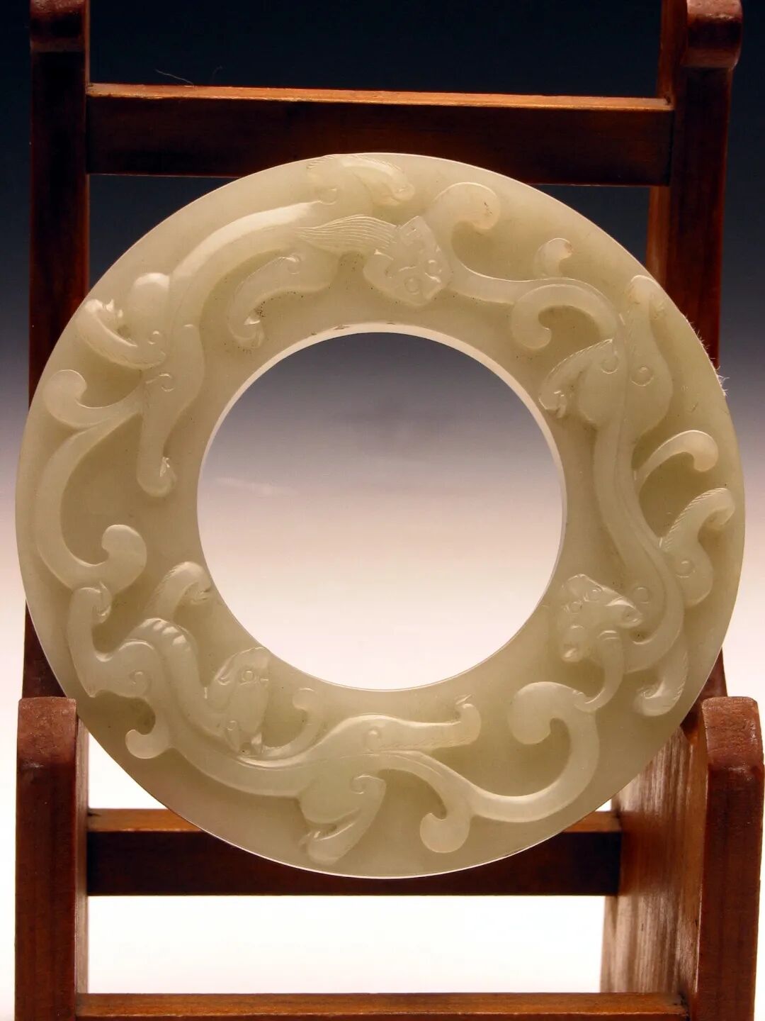 玉环青玉质,玉质莹润洁净。环上加饰三只等大螭龙,螭龙细颈长身,身躯虬曲遒劲、四肢无纹,呈爬行状,长尾分叉外卷。螭龙彼此咬尾嬉戏,造型矫健灵动,线条流畅优美。