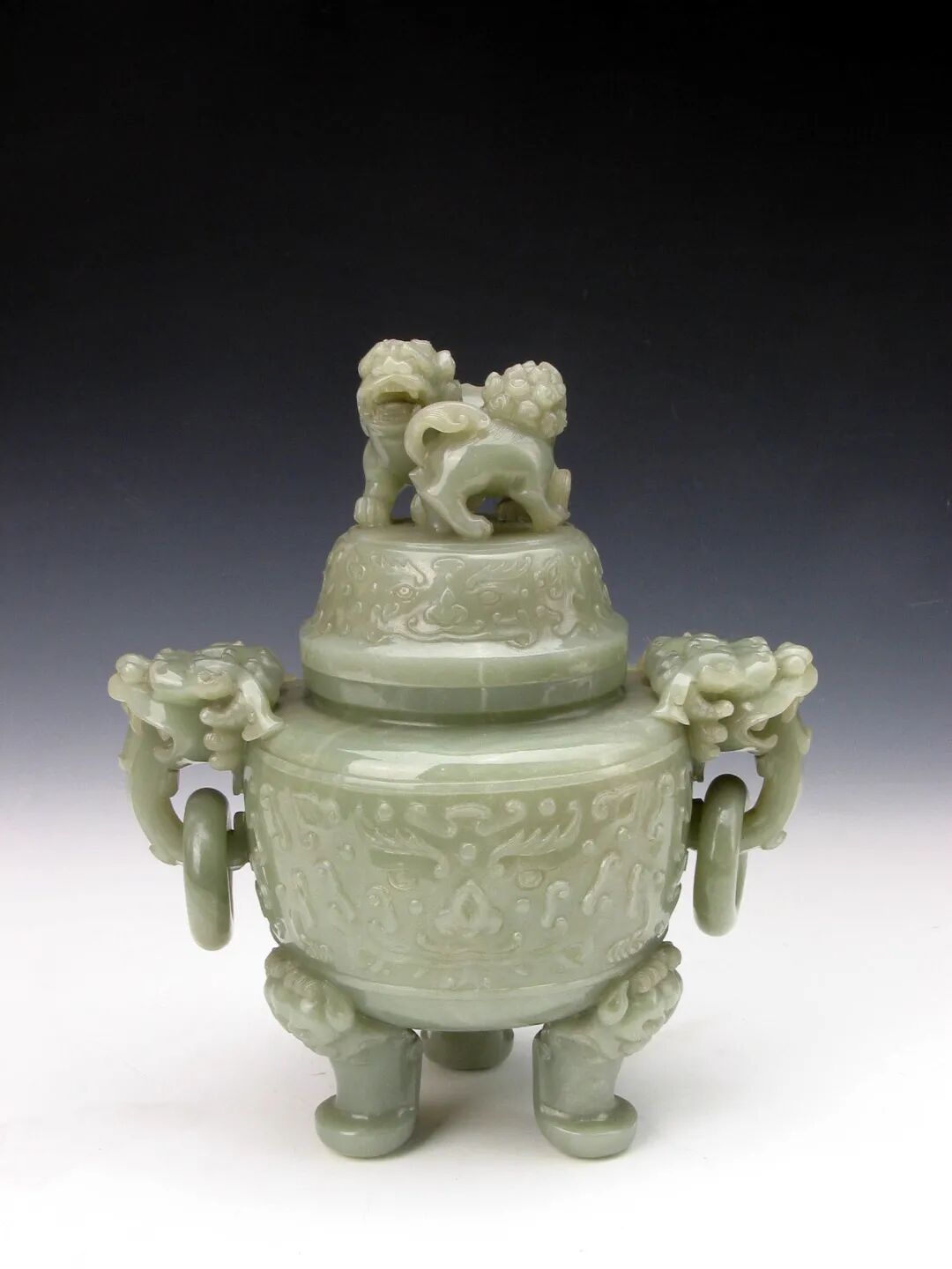 青玉香炉于乾隆年间由上等新疆和田青玉圆雕而成,玉质晶莹温润,雕工细腻,刀法娴熟,工艺精湛。