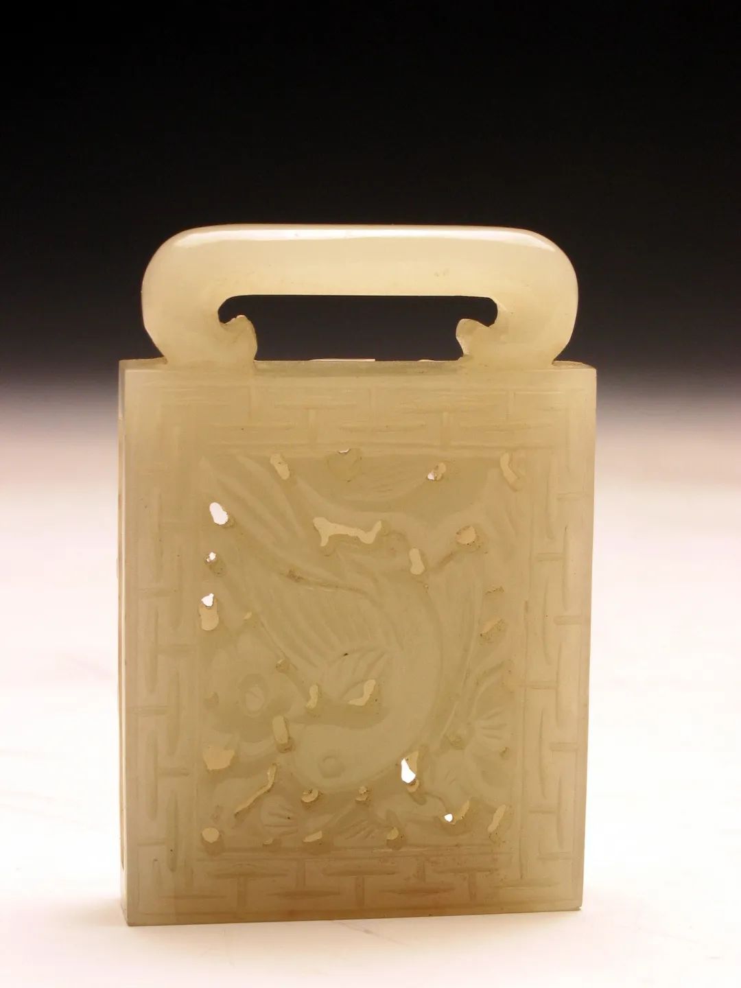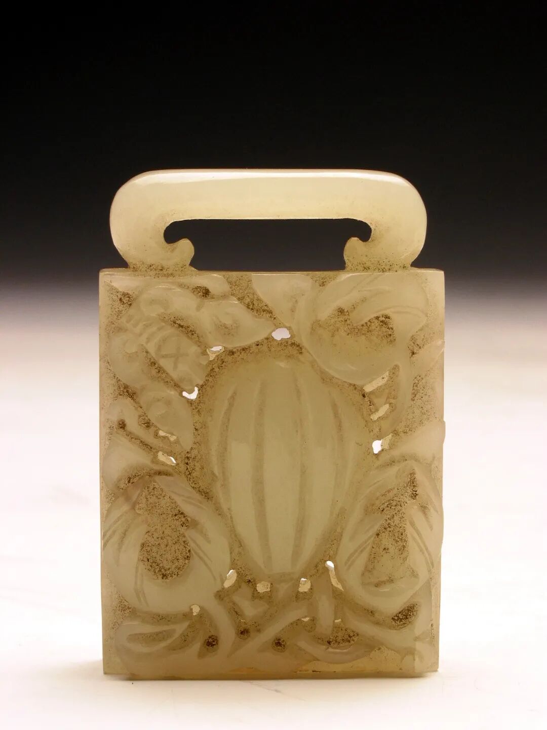 带环白玉质,正面中心琢刻垂枝瓜果一颗,四周分饰花叶、蝴蝶,背部饰有一鸟张嘴振翅站于花枝间,器底部为椭圆形环(古眼),造型构图鲜活,富有田园气息。