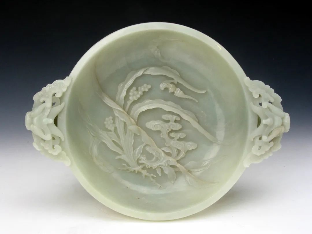 青玉雕制,总体呈浅盆状。洗内底部凸雕灵芝、万年青及一只蝙蝠,图案清晰,枝叶舒展。