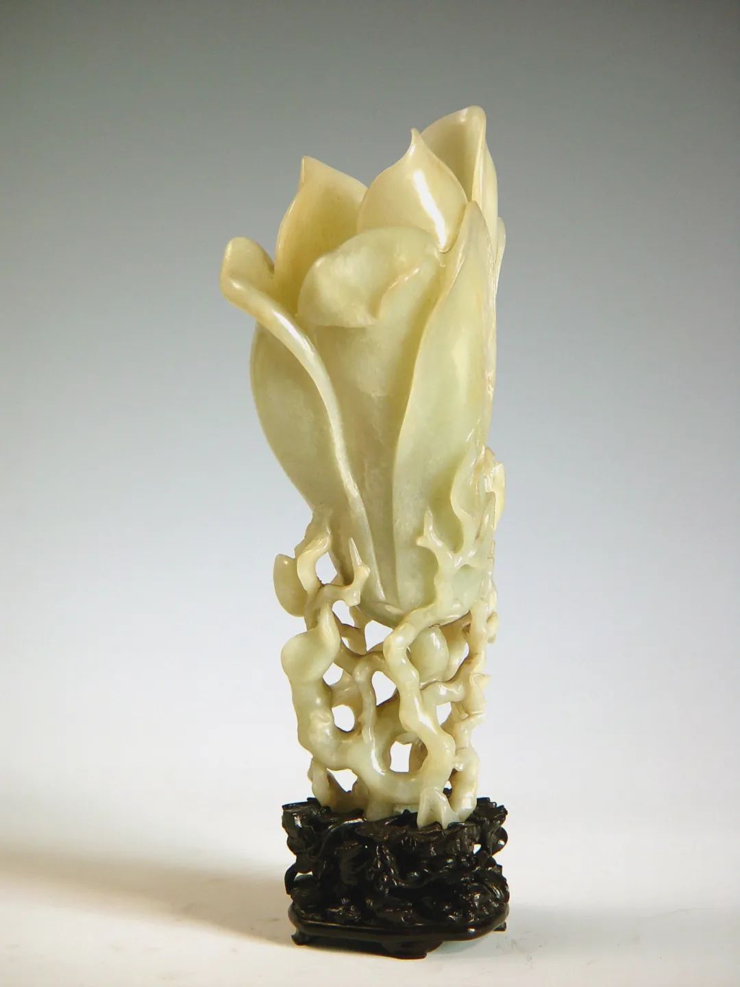 这件花插高25.3cm、口径10.7cm。白玉雕制,圆雕技法。整器呈一朵盛开的玉兰花,花瓣七片,洁白润泽,向上自然舒展,形成花插之形。花下透雕虬曲繁枝,托于花萼处。其造型清雅,花朵形态传神,与之相对,若闻花香。其下为透雕葵花木座。玉雕花插是陈设器,广泛制作于明代,总体结构简练,粗扩凝重;清代承袭其制,结构较为复杂,多为花朵、动物、植物等造型。