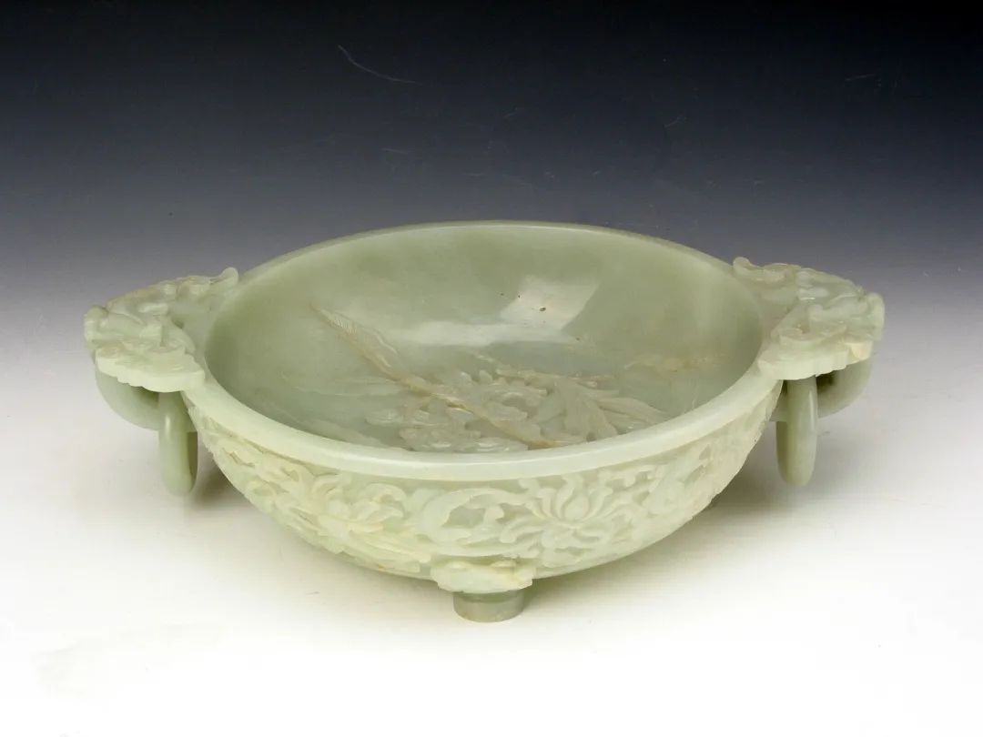 洗外壁浮雕串枝莲,底部雕有几何图案及卧蚕花纹,前后及左右各雕有一个圆足。此洗以蝙蝠、灵芝、万年青等图案象征福、寿之意,器形端正,雕工细腻,体现了清代玉器制作工艺的高超水平。
