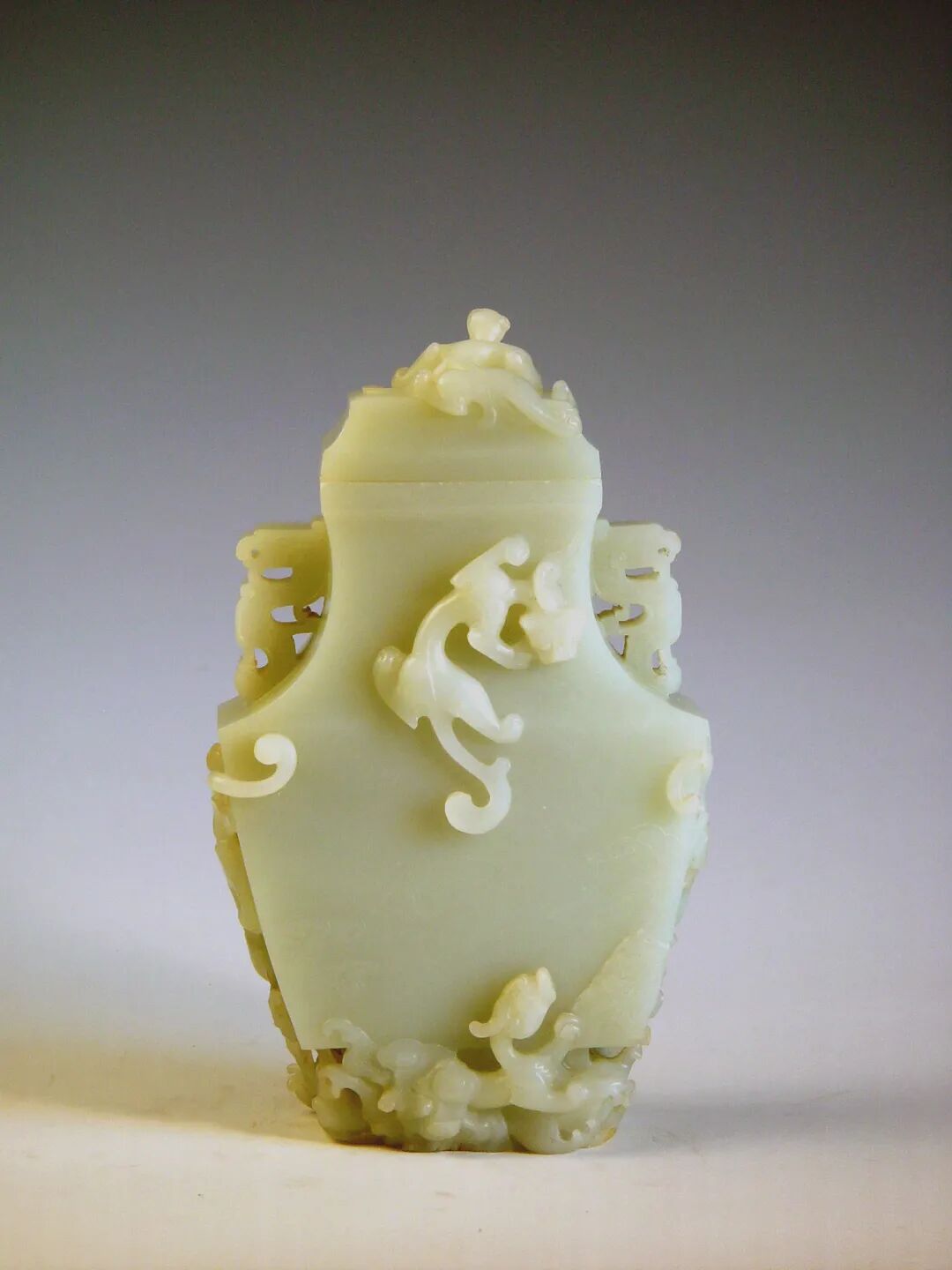 白玉质地,壶呈扁瓶造型。上部为方斗形盖,盖顶为一螭龙纽。方口,斜肩,颈部透雕夔龙双耳。壶腹呈倒梯形,表面为素地,壶颈部、腹部及足部高浮雕五只螭龙,神态各异,栩栩如生;壶腹部、底部另刻有云朵、海水纹。此件器物玉质纯净,雕工细腻,为精美的清代宫廷珍品。