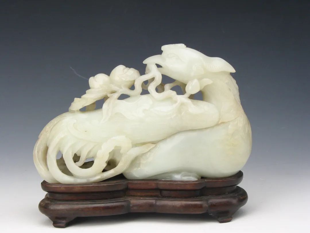 本件玉作以青玉材质雕制,采用浮雕、透雕、圆雕等多种手法刻一回首卧凤。凤为平卧状,头部回转,圆眼,尖喙如鸡,喙中衔一折枝桃枝;颈部饰以长翎,身饰鳞纹,短翅贴服于身;凤尾舒展向下卷曲与凤身平行;凤足蜷曲身下;其颈、翼、尾部均采用阳刻技法,雕刻出细如发丝的羽毛,面、腹、足则光素无纹。凤下附以木座。这件青玉雕卧凤玉料精良,雕刻精细,利用玉之光洁润泽雕出凤之风姿迷人,赋予一种曲线美和动态美的艺术享受。