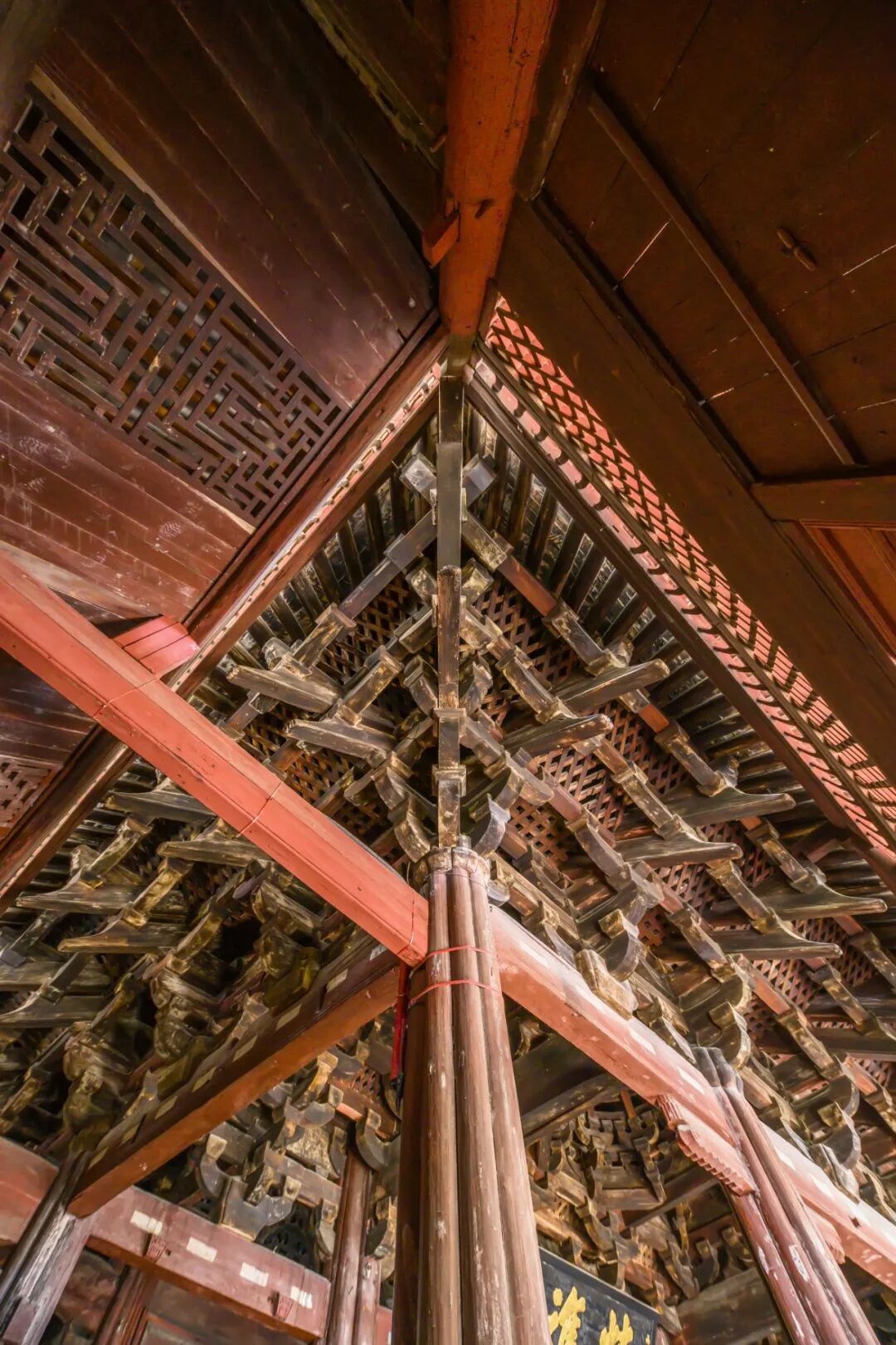 精确的榫卯使斗拱层层相衔,以小拼大的四段合瓜棱柱撑起整座大殿,可谓浙江木构的顶尖之作,且是《营造法式》营造技巧的直接来源,为宋代建筑技术巅峰。