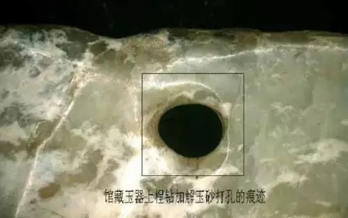 桯钻打孔过程中,需要加潮湿解玉砂,早期会留下较大的马蹄孔,回来出现了青铜材质的桯钻,孔就越来越小,因为是手工转动,难免不能一鼓作气在同一个点上钻动,必须要反复起钻,加上钻的磨损,同时进入孔的解玉砂的粗细不同,就会留下不规则的孔壁,和粗细不同的螺旋线痕迹,现在的打孔也会有螺旋线,只不过两种螺旋线特征不一样而已(划重点)。