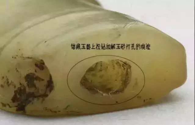 下部: 孔洞下方1/3处。由于这个部位是孔洞最窄处,也是研磨砂积聚最多的地方,关注公众号:古玉虫。所以很容易在孔壁留下明显的旋痕。旋痕特点同中部是一样的,只是相对于中部要多一些而已。