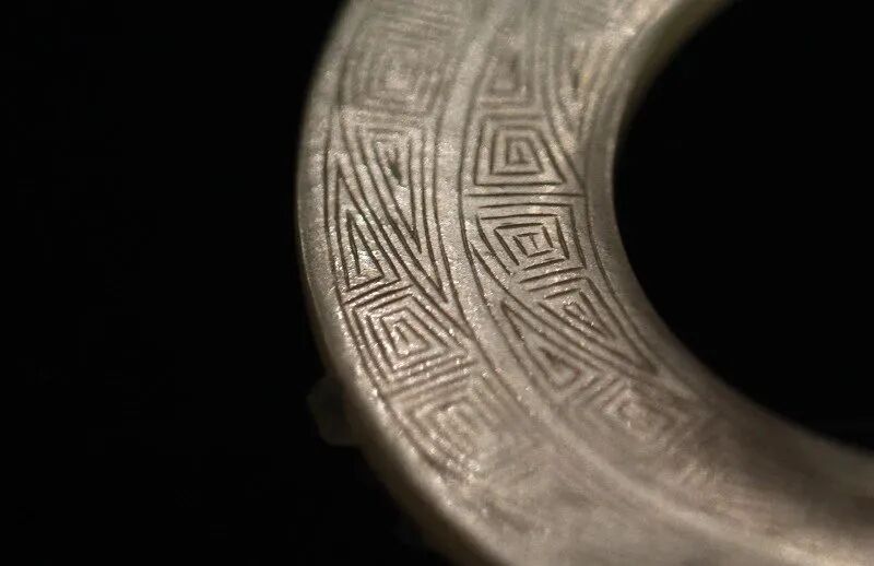 到了汉代,使用铁制大型管钻工具加工玉璧,内孔及外缘全部用管钻制作。加工过程中,由于潮湿解玉砂颗粒大小不同,会在孔壁残留间距不等、深浅不一的螺旋状痕迹,如图所示。