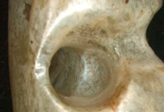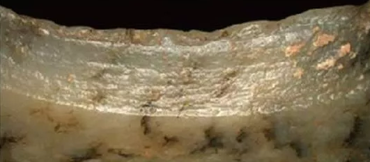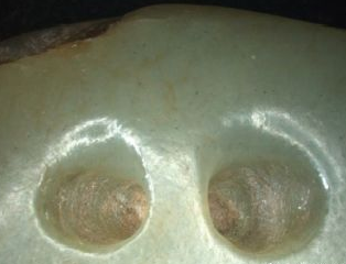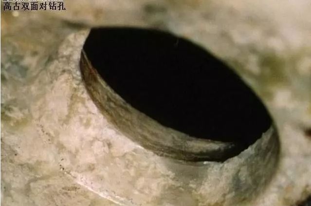 上部:孔洞上口,整个深度的1/3处。这个位置同样由于研磨砂的反复进出、摩擦,孔壁相对比较光滑,几乎没有旋痕。年代越久远,特征越明显中部: 孔洞中间部位。这个部位相比上部而言,由于通道较窄,孔壁开始出现旋痕。但旋纹宽窄、深浅、疏密不一,比较杂乱。