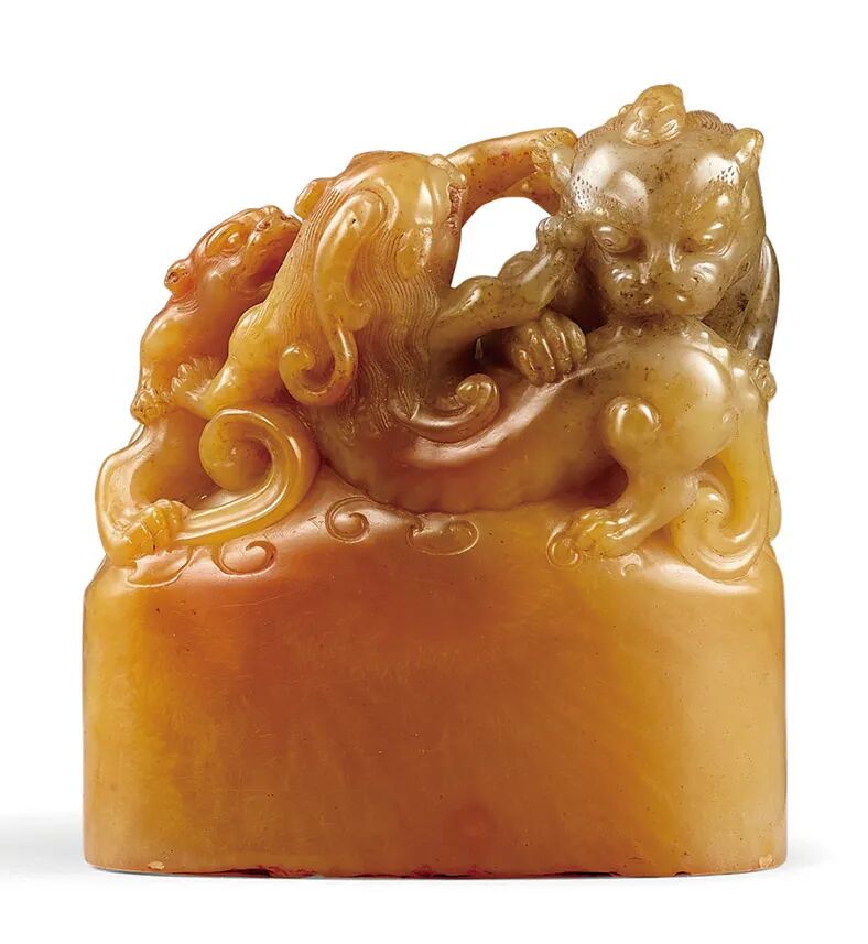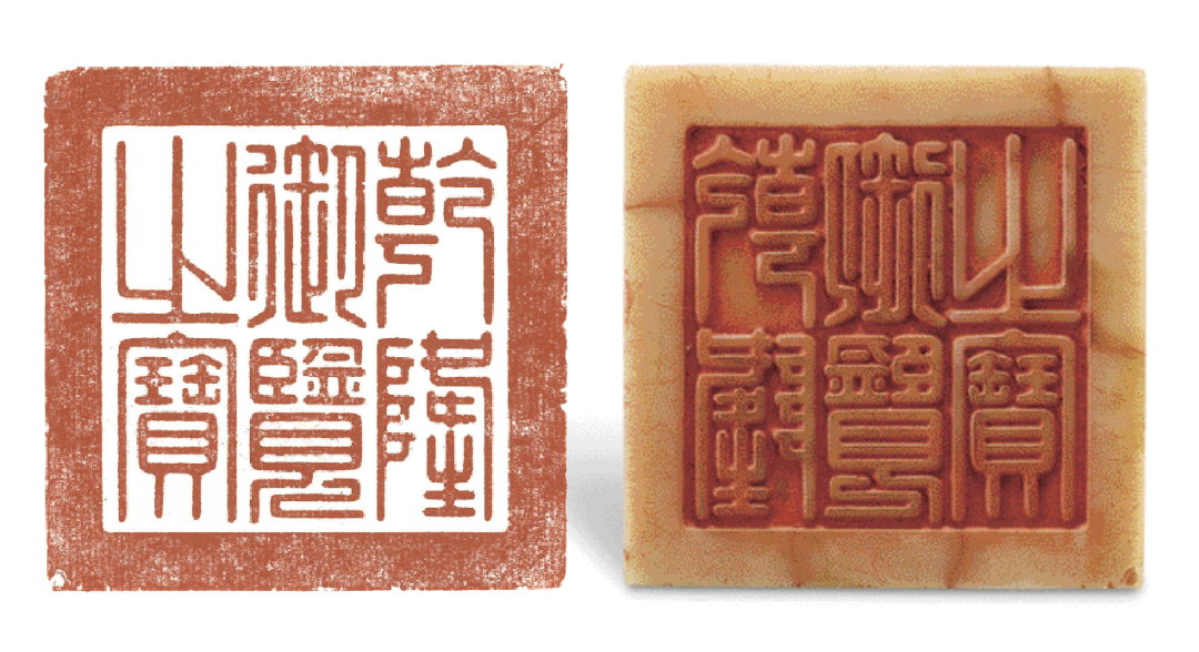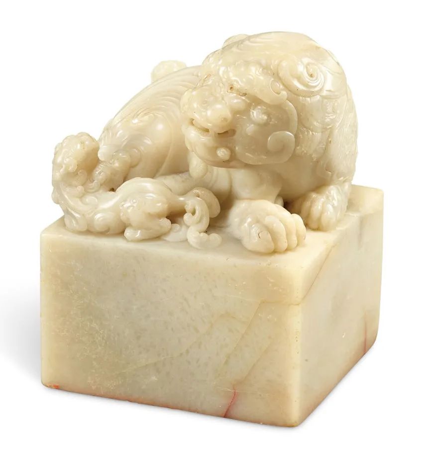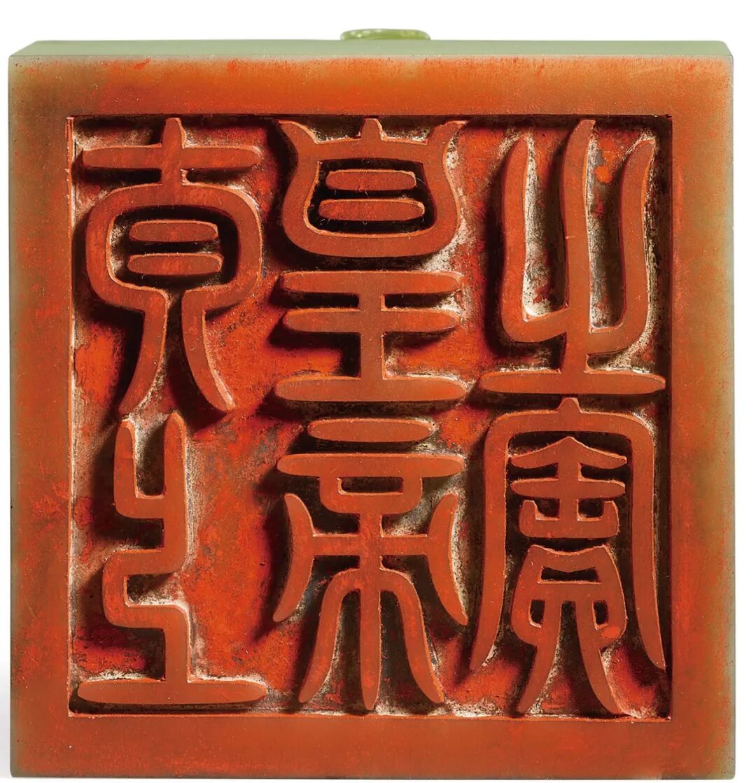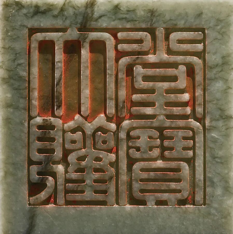 〈乾隆帝御宝太狮少狮钮寿山石〉印文,或许是中国艺术史上最闻名遐迩的。无数丹青重宝上,玺印朱砂深深烙。范宽《溪山行旅图》轴、郭熙《早春图》轴、王希孟,《千里江山图》卷,众多大师笔下的巨作,从宋徽宗到郎世宁,几乎重要书画名作都与这颗宝玺一物相连。印面六字「乾隆御览之宝」,诚然鉴藏宝玺中最具代表性者。此寿山石宝玺钤盖在一幅又一幅的巨作上,印面留下岁月的摩挲。篆文上美丽的磨痕,更是与丹青数以百计的抱拥、绝对是帝君沉醉艺藏的证据。这座宝玺于1965年于伦敦苏富比上拍,由吴权博士投得。