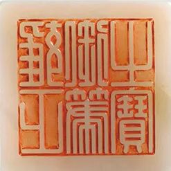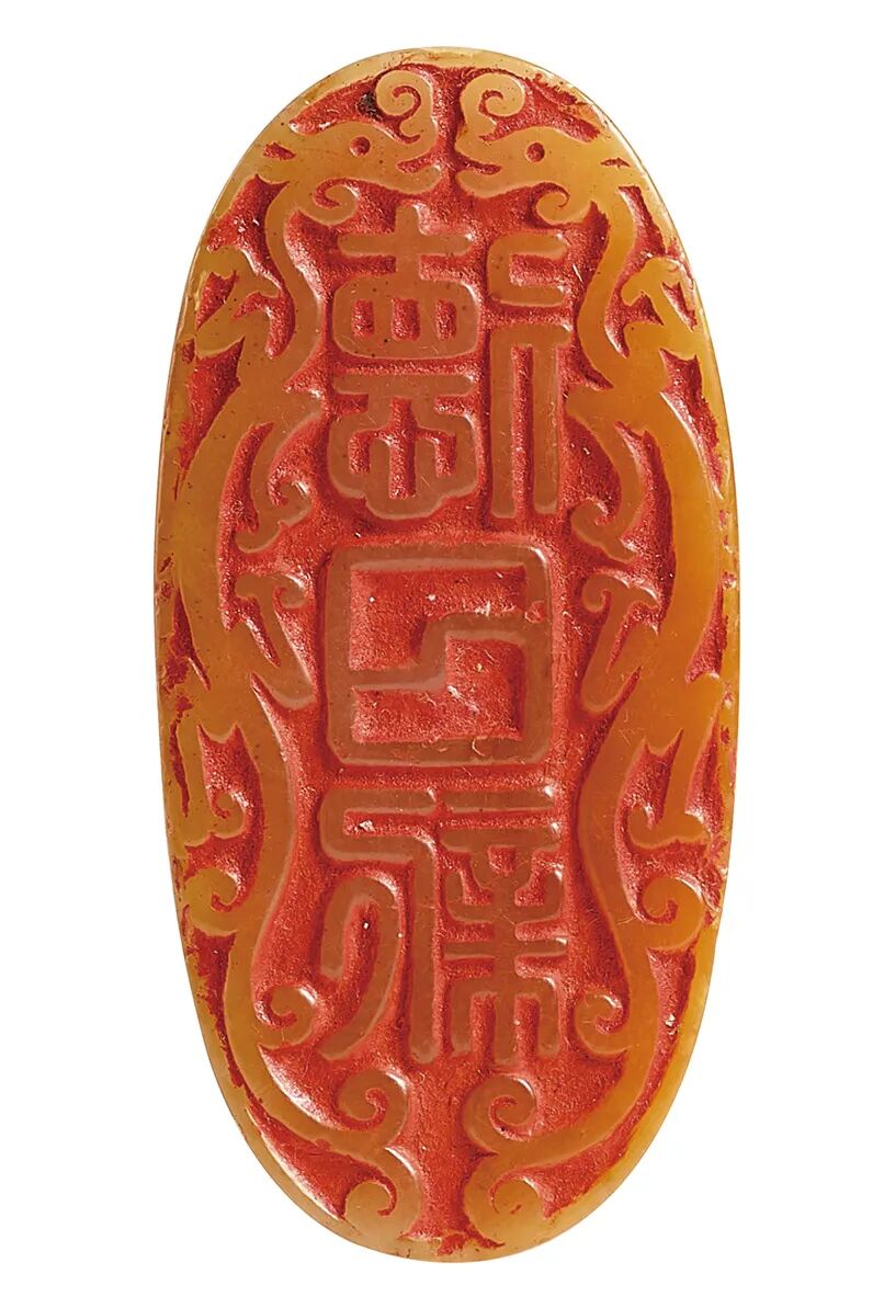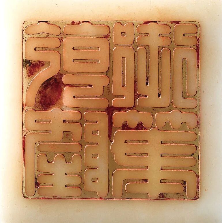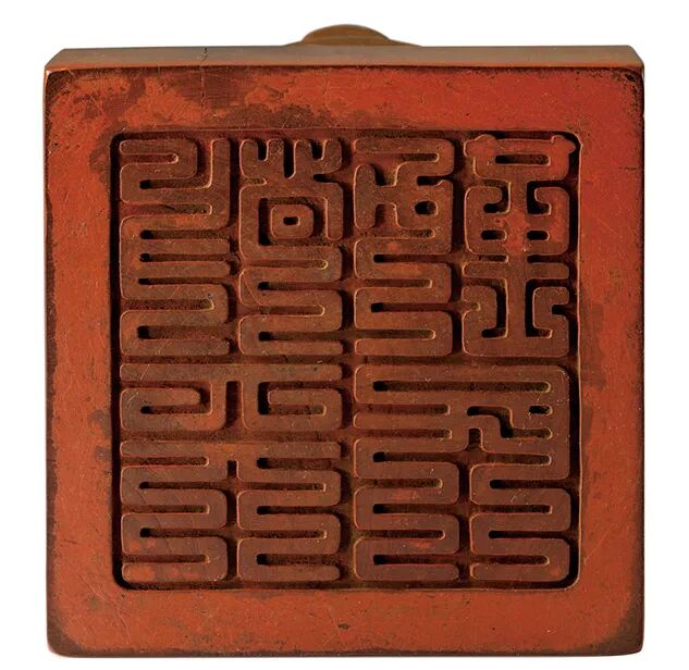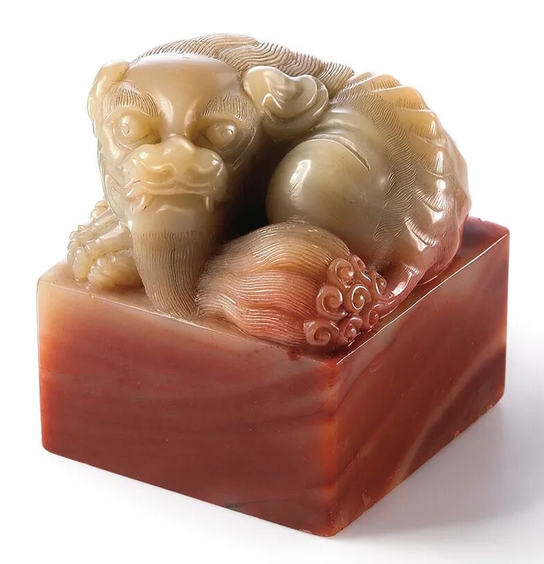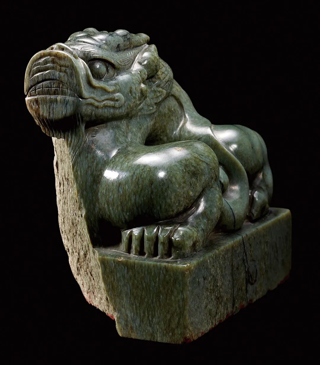 〈乾隆帝御宝太狮少狮钮寿山石〉印文,或许是中国艺术史上最闻名遐迩的。无数丹青重宝上,玺印朱砂深深烙。范宽《溪山行旅图》轴、郭熙《早春图》轴、王希孟,《千里江山图》卷,众多大师笔下的巨作,从宋徽宗到郎世宁,几乎重要书画名作都与这颗宝玺一物相连。印面六字「乾隆御览之宝」,诚然鉴藏宝玺中最具代表性者。此寿山石宝玺钤盖在一幅又一幅的巨作上,印面留下岁月的摩挲。篆文上美丽的磨痕,更是与丹青数以百计的抱拥、绝对是帝君沉醉艺藏的证据。这座宝玺于1965年于伦敦苏富比上拍,由吴权博士投得。