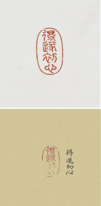 《乾隆宝薮》记载,「得遂初心」印玺有两款,一长方一椭圆。椭圆的一方为巴黎吉美博物馆创办家族所出,2008年10月8日经香港苏富比拍出,编号2004,HK$446万成交。同组「太上皇帝」玺则售于巴黎苏富比2008年12月18日,编号6。