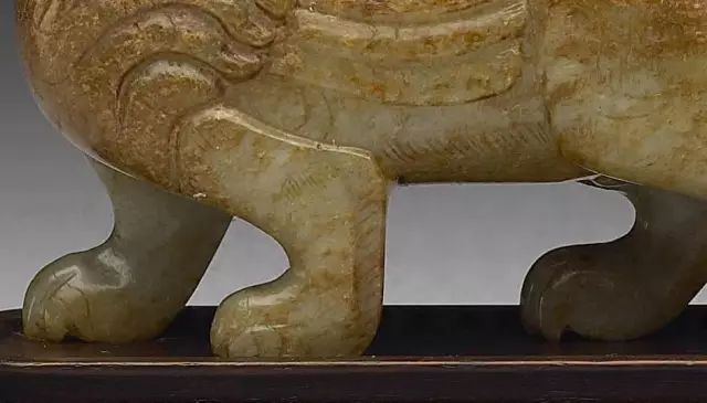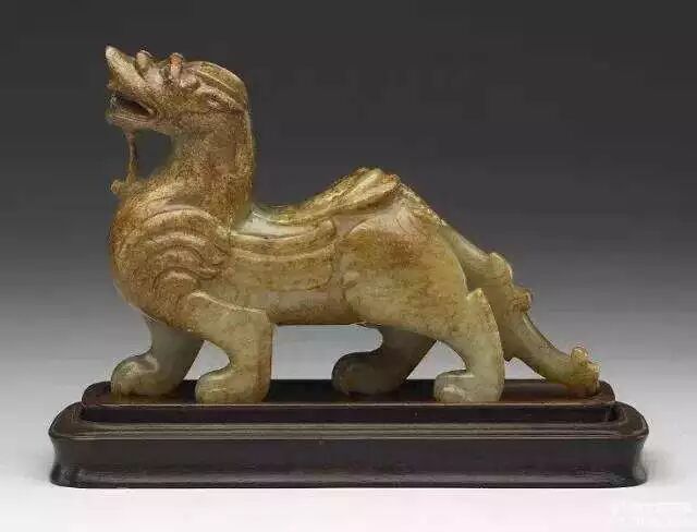 辟邪,是想象中的神话动物,顾名思义,是人们希望藉助它的法力,来避除邪恶。流行于汉代的辟邪,多为带翼的四足兽,其造形可能传自西亚。常以巨石雕刻,立于陵墓前。也用美玉琢成,作为极高贵的陈设器。这件玉辟邪以青白玉琢成,昂首张口,似在低吼。跨步游走,双翼虽贴于身侧,却做蓄势待发状。颔下长须垂胸,长尾曳地,器宇非凡。因曾经深沁熟盘,甚至再被染色,所以表面多有深浅褐斑。这是目前所知的汉代玉辟邪中,体积较大的一件。它的口吻较长,有似马脸,与常见的短口吻似虎脸的辟邪不相类似。却与近年在内蒙古出土的西汉中、晚期铜灶上所加饰的动物头像,颇为神似。学者多称铜灶上的动物为「龙头」。故宫的这件玉辟邪,曾为帝王重要的收藏。辟邪的胸前刻有御制诗。宫中还配有双层紫檀木座,上层刻有「乾隆御玩」,下层刻有与辟邪胸前相同的御制诗,刻字的部分还嵌有银丝。